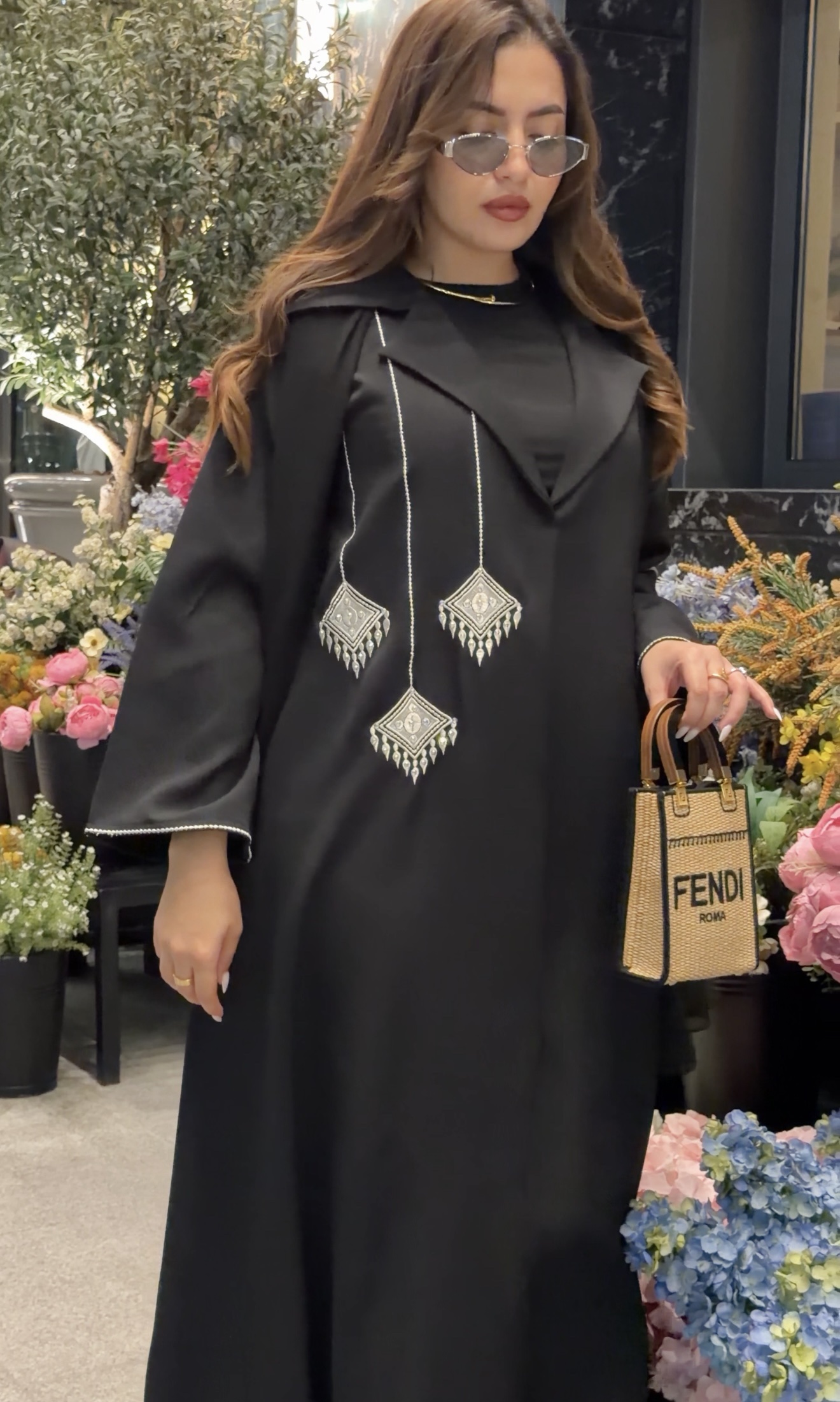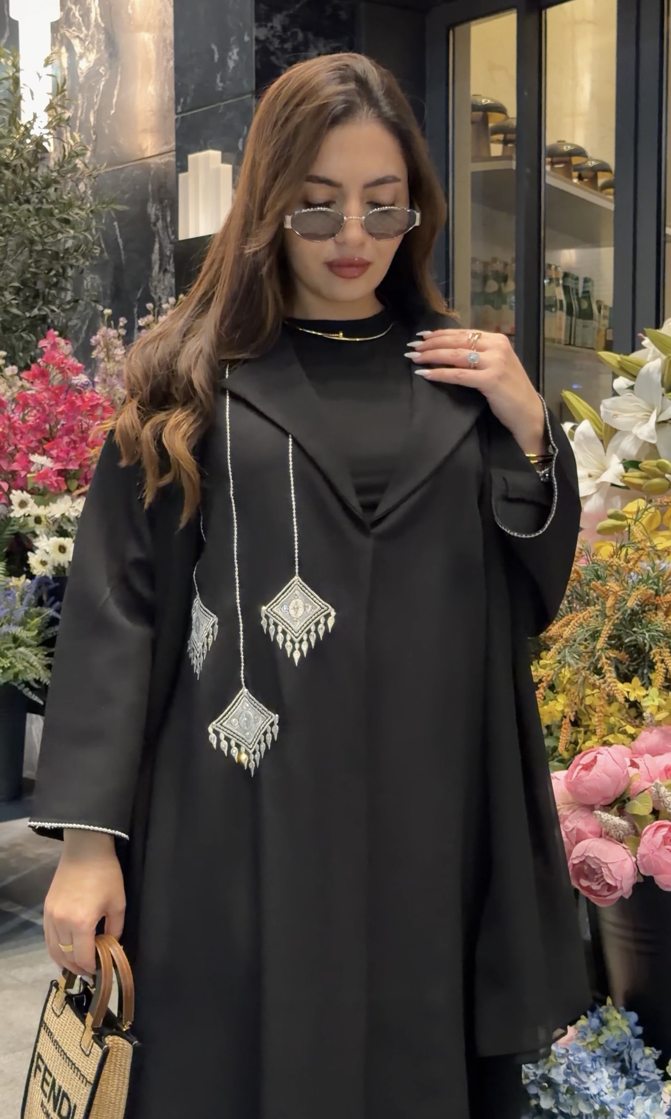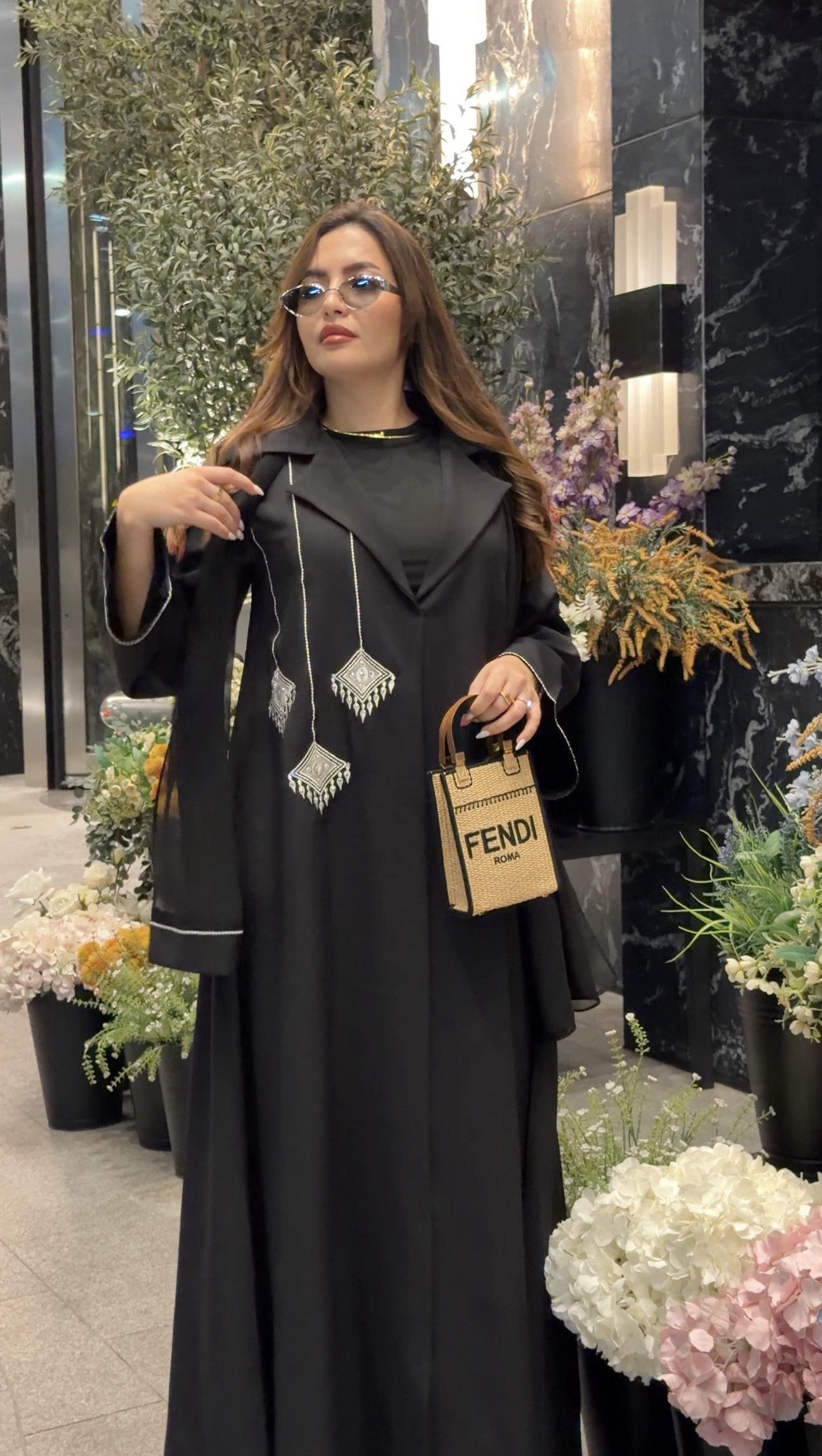 عباية مشاعل تجسّد الفخامة الهادئة وتفاصيل الأناقة الراقية، مصنوعة من أفخم أنواع قماش الكريب الخاص بالعبايات، بقماش انسيابي وثقيل يعطي مظهراً ملكياً وثباتاً مثالياً على الجسم.