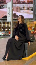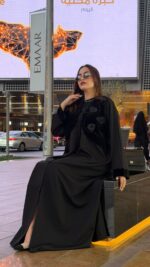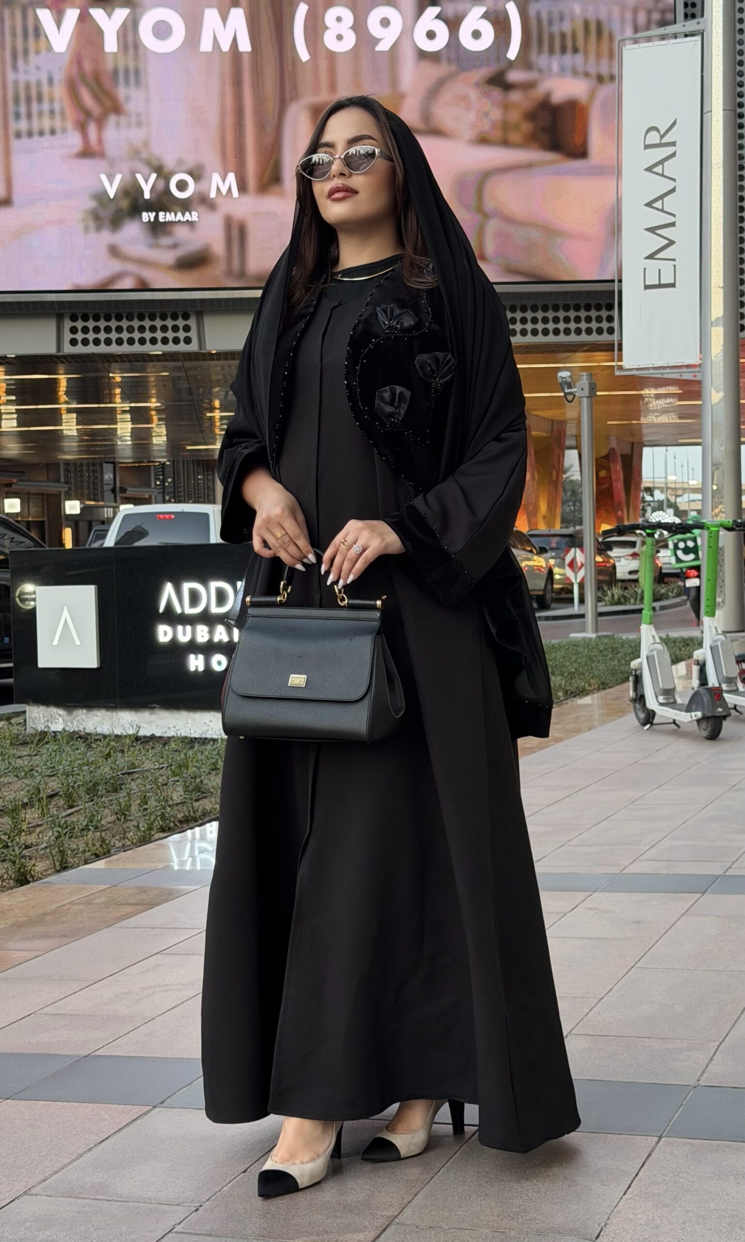 العباية مخدومة يدويًا بالكامل بالإبرة والخيط، مزينة في الجيلي بورود ناعمة من قماش الساتان، بينما تزيّن الجوانب بالكامل بأحجار سوداء لامعة تم تثبيتها يدويًا بدقة عالية، مع لمسة راقية من الدان في نهاية الأكمام و الخيمار كما هو واضح في الصورة.
