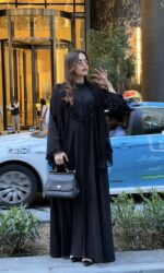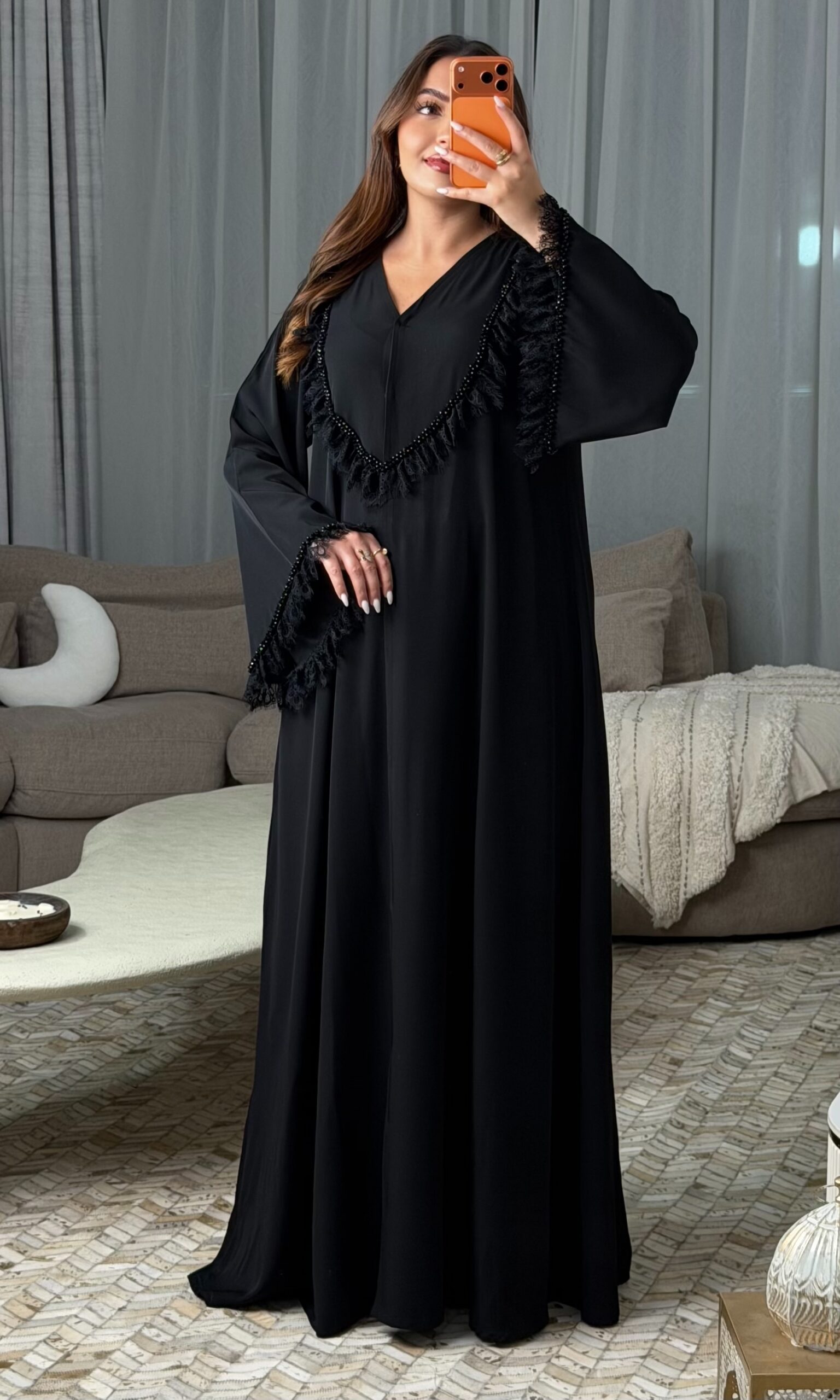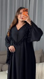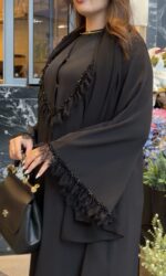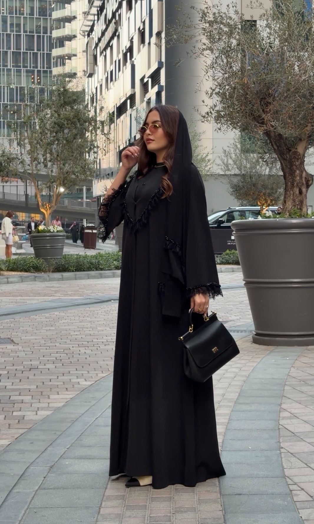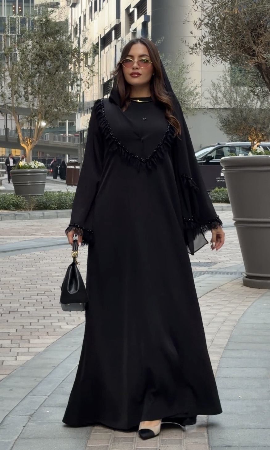 تتزين العباية بتفاصيل فاخرة من الدانتيل الراقي في الصدر والأكمام والخمار (الفولار)، مع لمسات من الأحجار السوداء اللامعة التي تضيف بريقًا ناعمًا وأناقة غير مبالغ فيها.