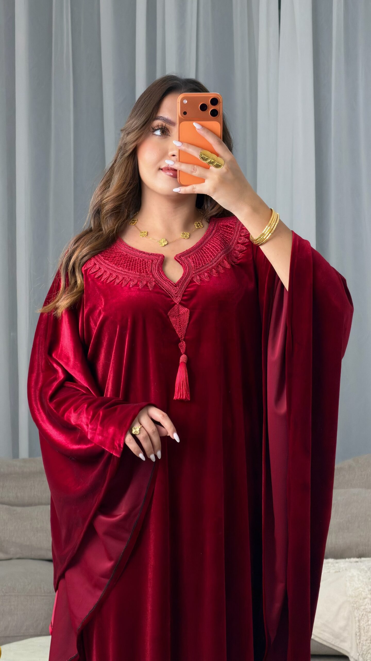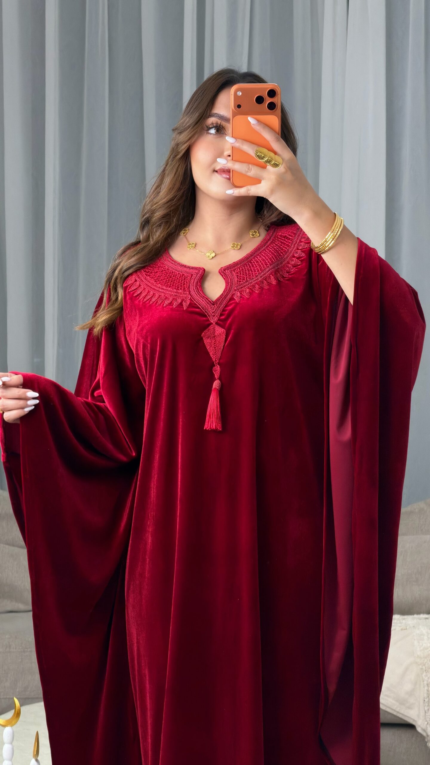مزين بتطريز وحياكة يدوية متقنة في منطقة الصدر، تضيف لمسة فخامة ورقي للتصميم، ليكون خياراً مثالياً لسهرات رمضان والعيد.