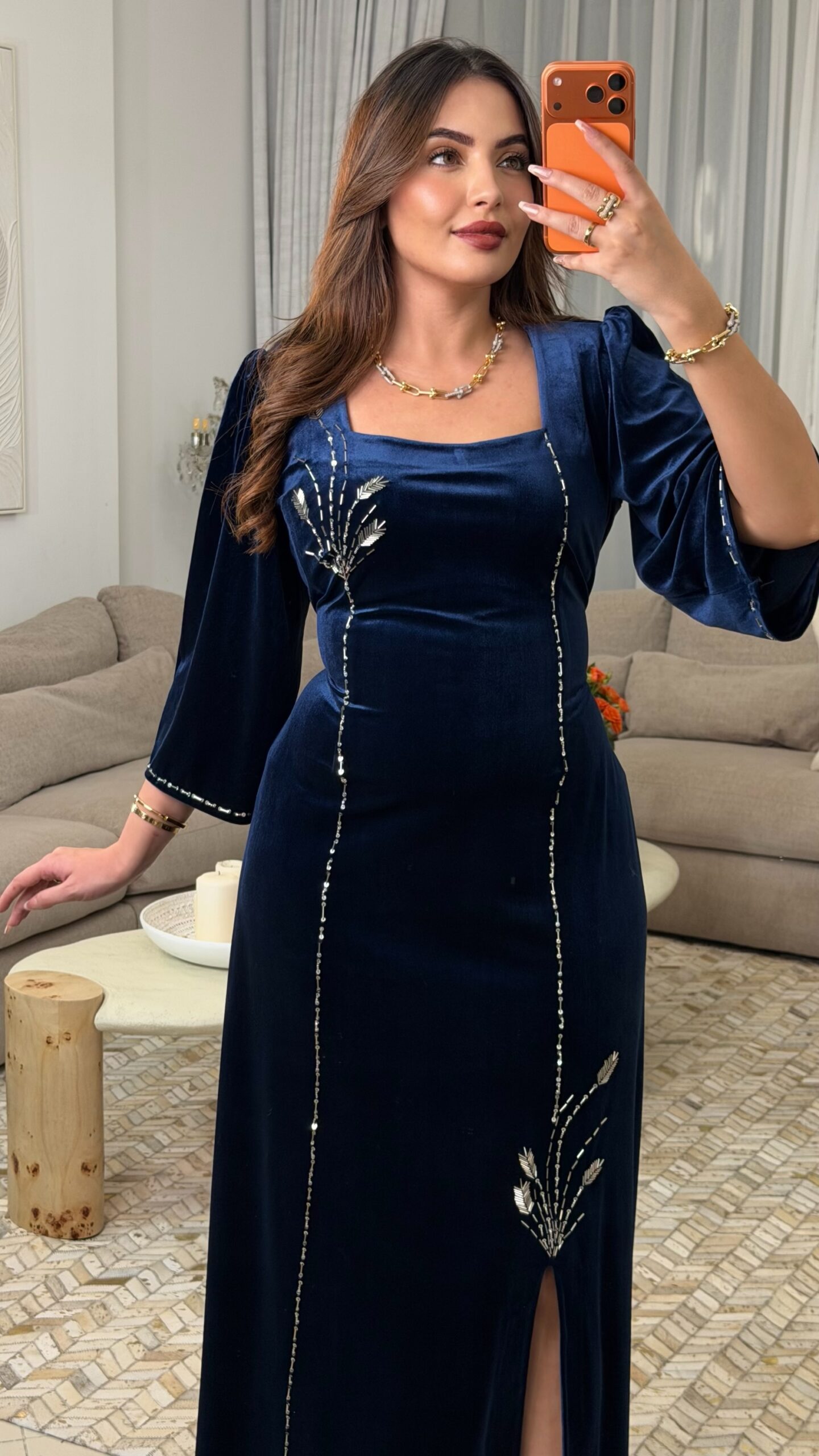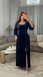 يتميّز بقصّة أنثوية ناعمة مع فتحة أمامية أنيقة وتفاصيل ذهبية دقيقة تمتد على طول الفستان، ويمكن ربطه بحزام خلفي لإبراز الخصر وجمال القوام.