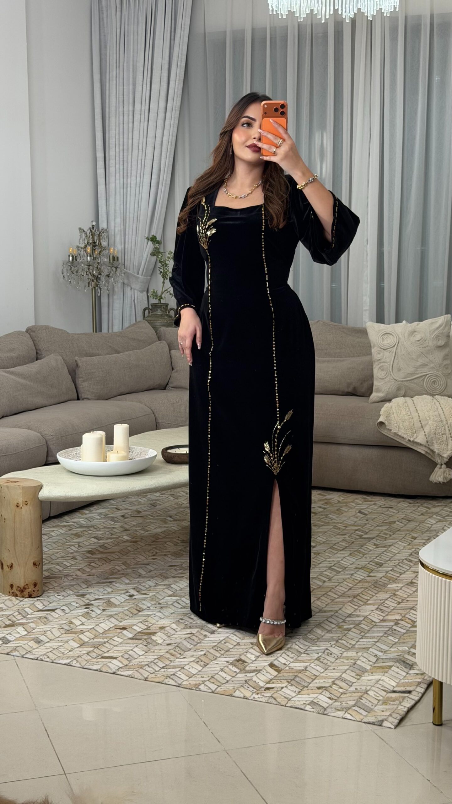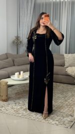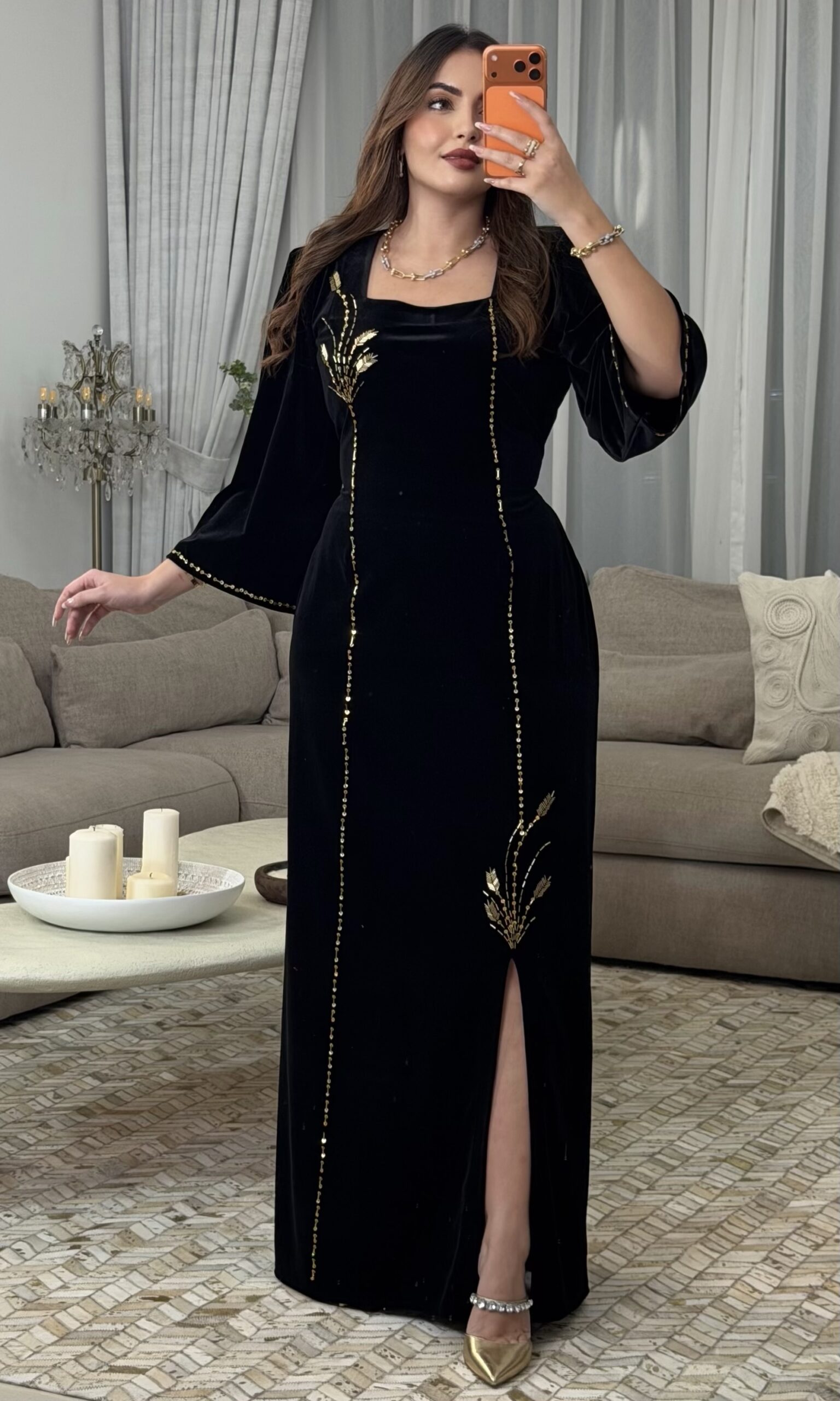 يتميّز بقصّة أنثوية ناعمة مع فتحة أمامية أنيقة وتفاصيل ذهبية دقيقة تمتد على طول الفستان، ويمكن ربطه بحزام خلفي لإبراز الخصر وجمال القوام.