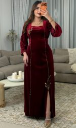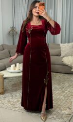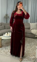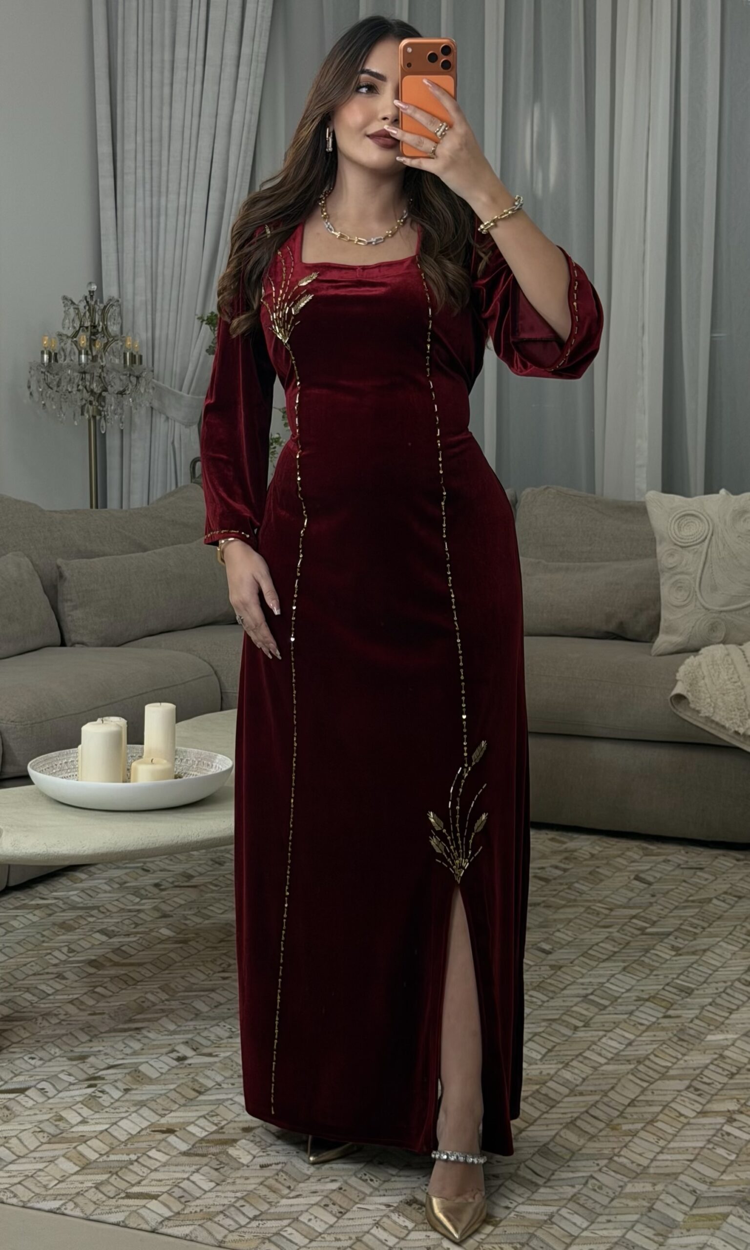يتميّز بقصّة أنثوية ناعمة مع فتحة أمامية أنيقة وتفاصيل ذهبية دقيقة تمتد على طول الفستان، ويمكن ربطه بحزام خلفي لإبراز الخصر وجمال القوام.