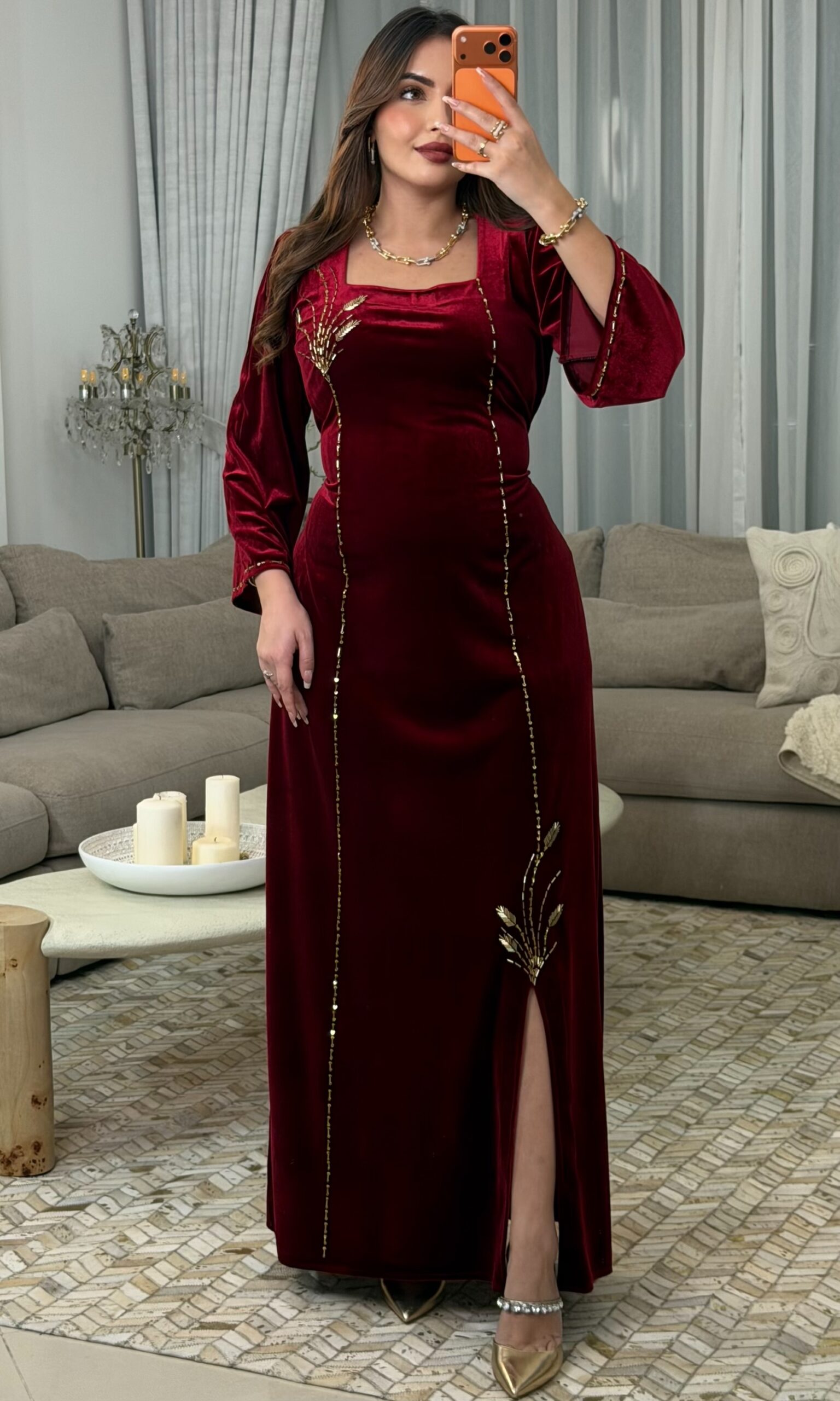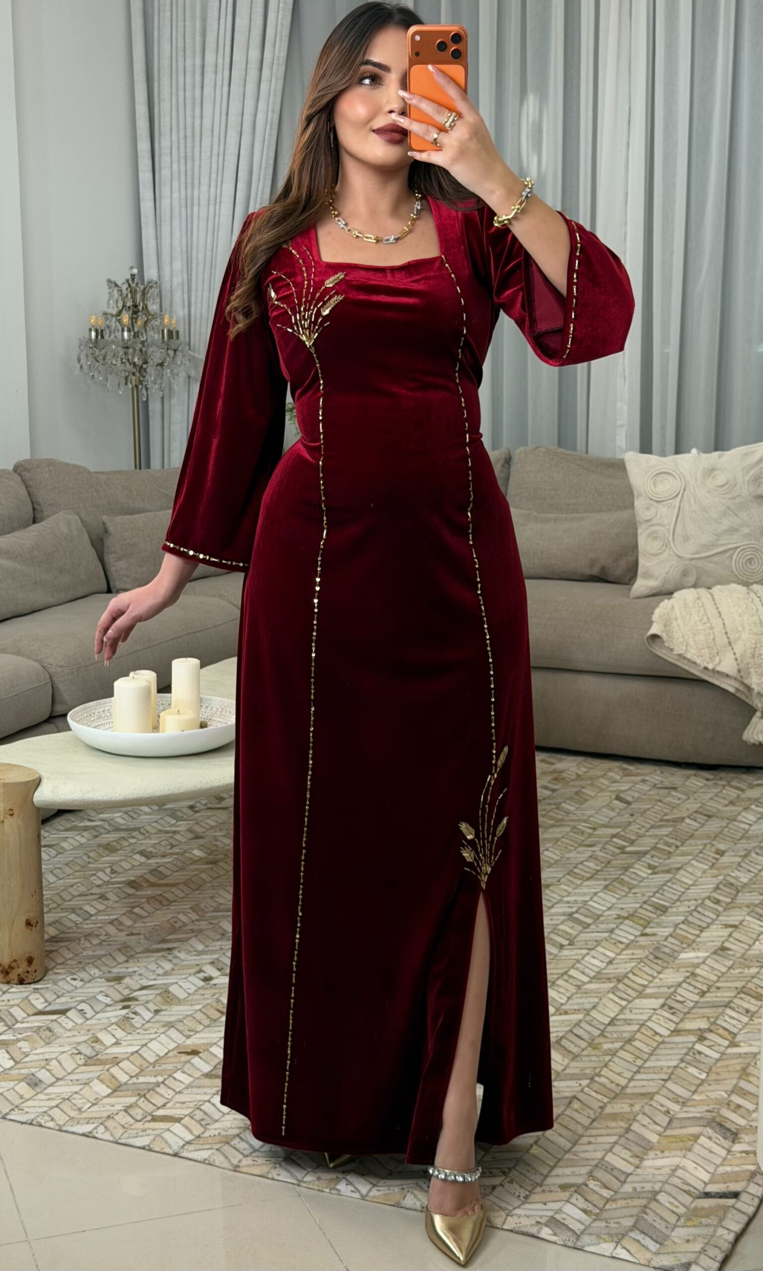 مصنوع من قماش القطيفة روايال الفاخر الذي يمنحك حضورًا ملكيًا، و مزين يدويًا بـ أحجار كاسي الأصلية التي تضيف لمسة من البريق الراقي.