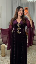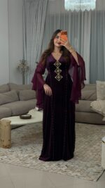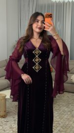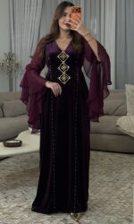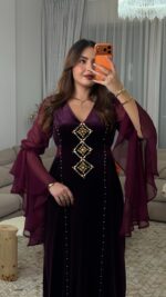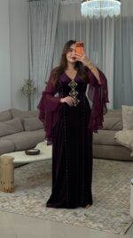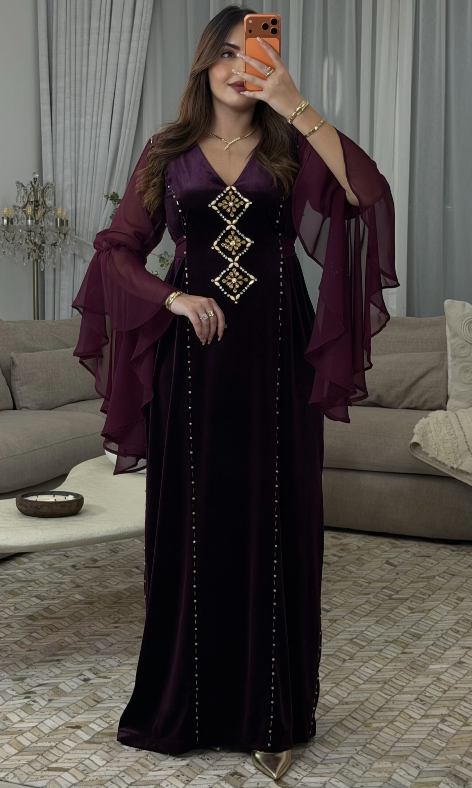 مصنوع من قماش القطيفة روايال الفاخر الذي يبرز فخامة الخامة وانسياب القَصّة، ومُزيَّن بـ أحجار أصلية مركّبة يدويًا بعناية لتضيف لمسة من اللمعان الراقي.