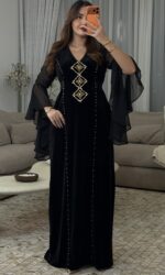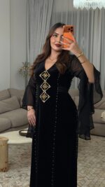 مصنوع من قماش القطيفة روايال الفاخر الذي يبرز فخامة الخامة وانسياب القَصّة، ومُزيَّن بـ أحجار أصلية مركّبة يدويًا بعناية لتضيف لمسة من اللمعان الراقي.