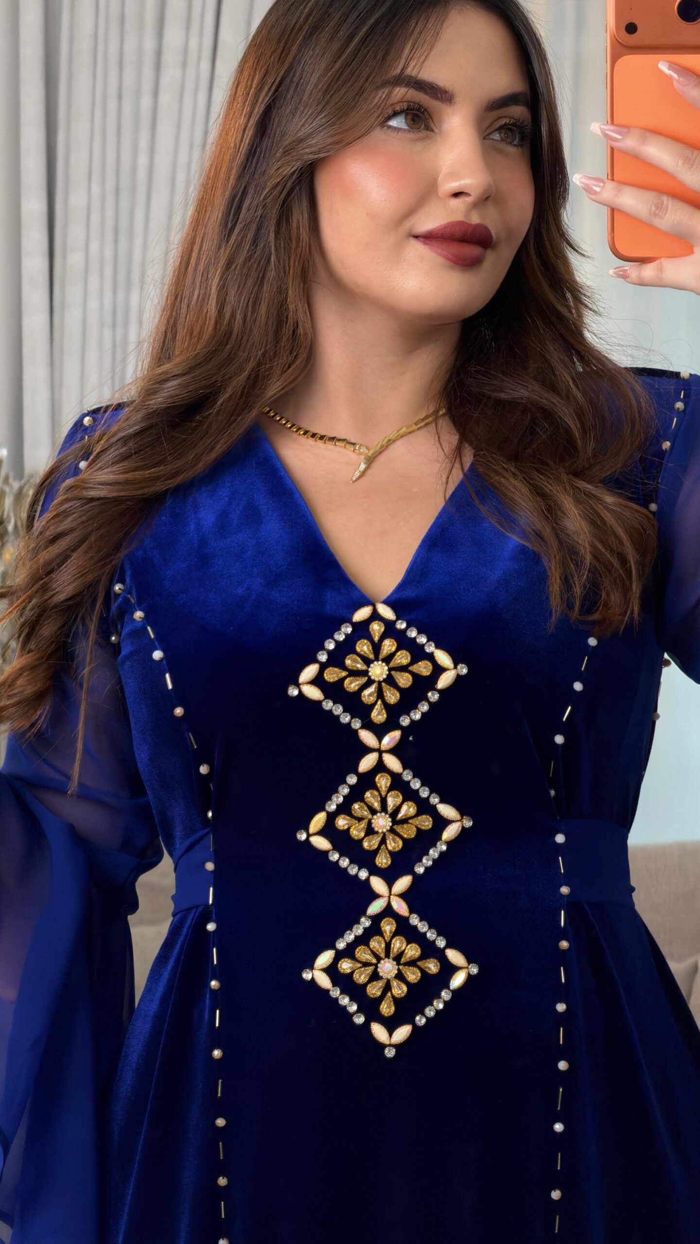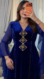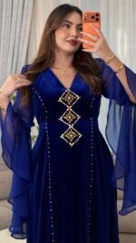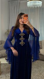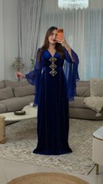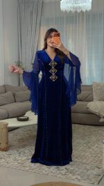مصنوع من قماش القطيفة روايال الفاخر الذي يبرز فخامة الخامة وانسياب القَصّة، ومُزيَّن بـ أحجار أصلية مركّبة يدويًا بعناية لتضيف لمسة من اللمعان الراقي.