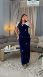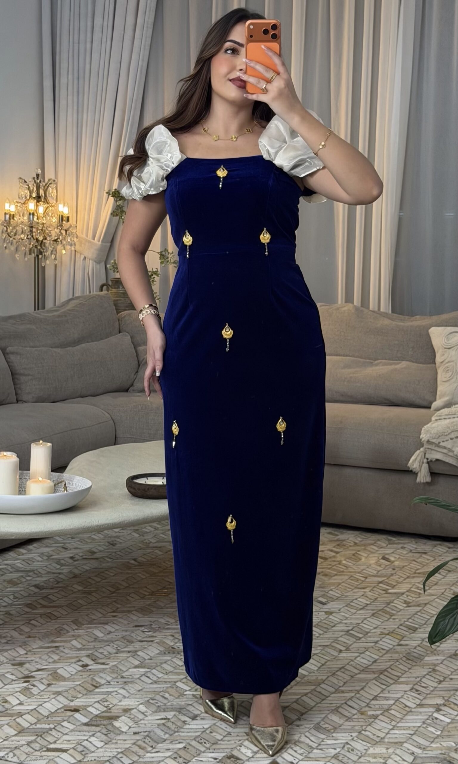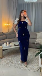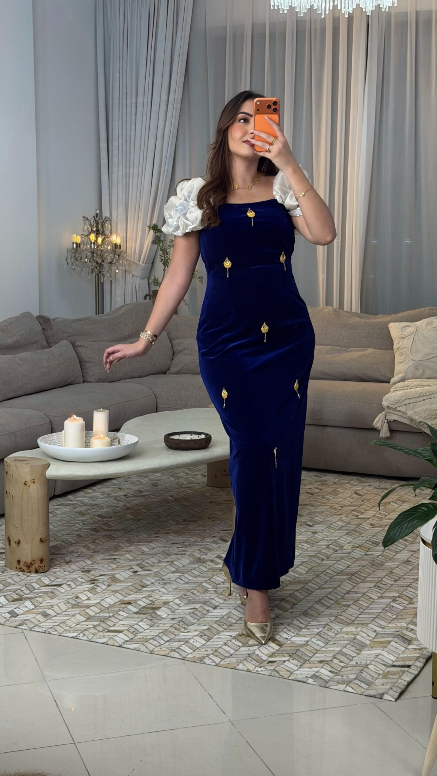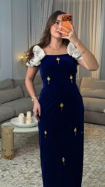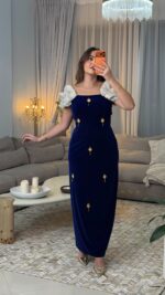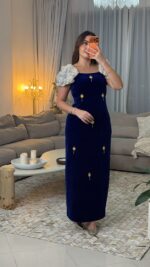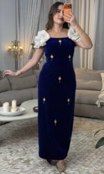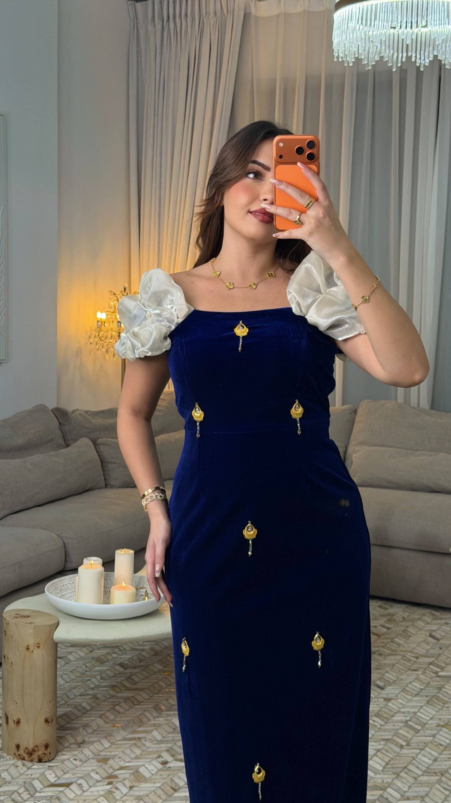 مصنوع من قماش القطيفة الفاخر الذي يعكس الأناقة في كل تفصيل، مع أكمام من الأورغانزا تضيف لمسة من النعومة والتميّز.