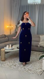 يتزيّن الفستان بـ زخارف ذهبية فاخرة مُركّبة يدويًا بعناية ودقّة عالية، ويُربط من الخلف بحزام لإبراز الخصر وجمال القوام.