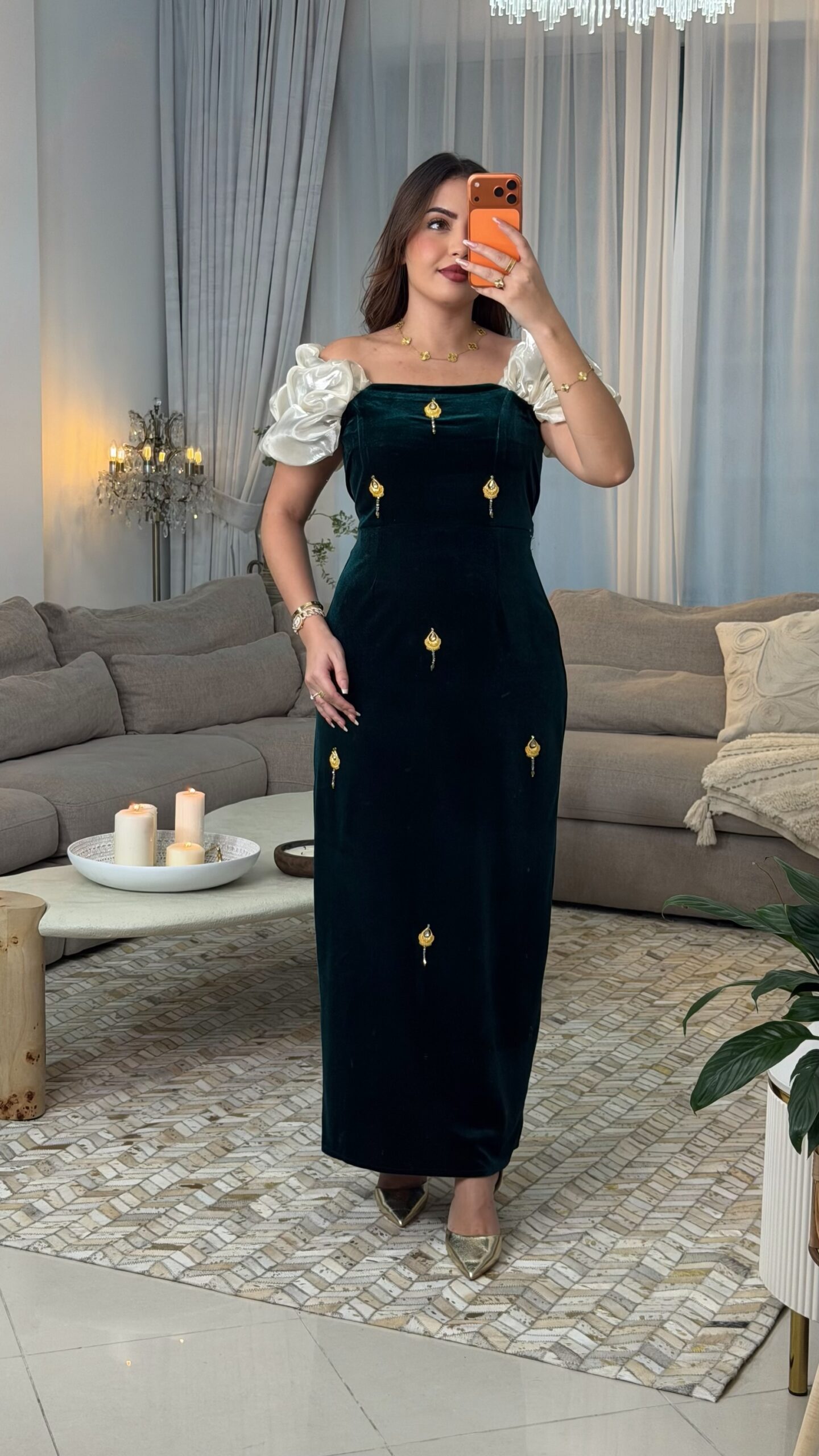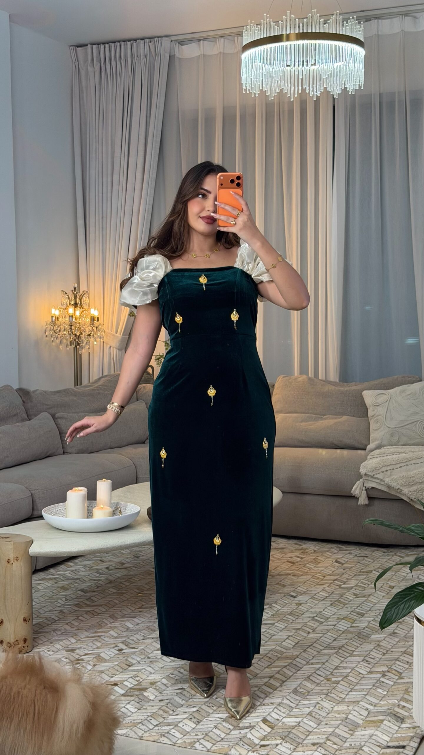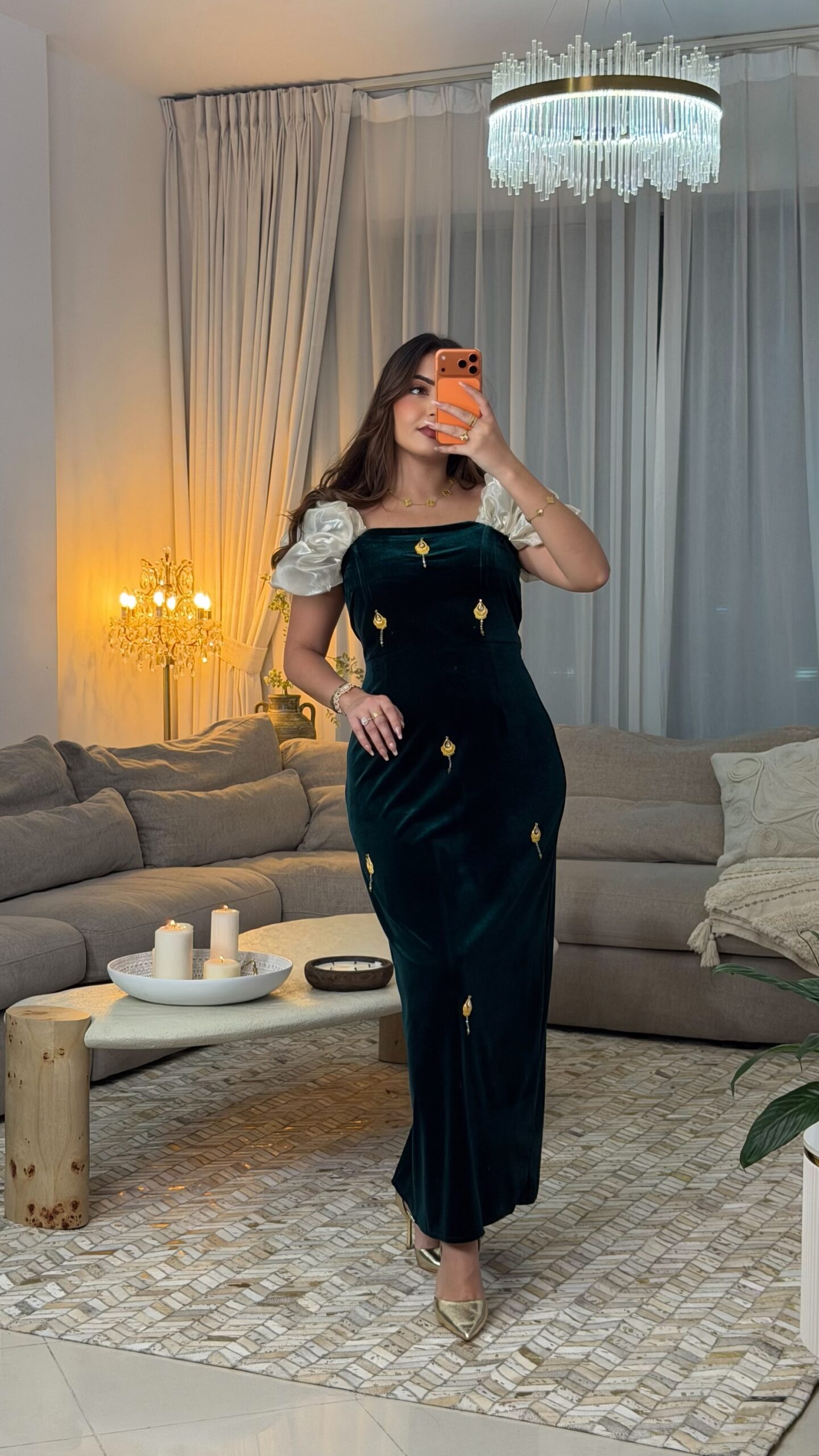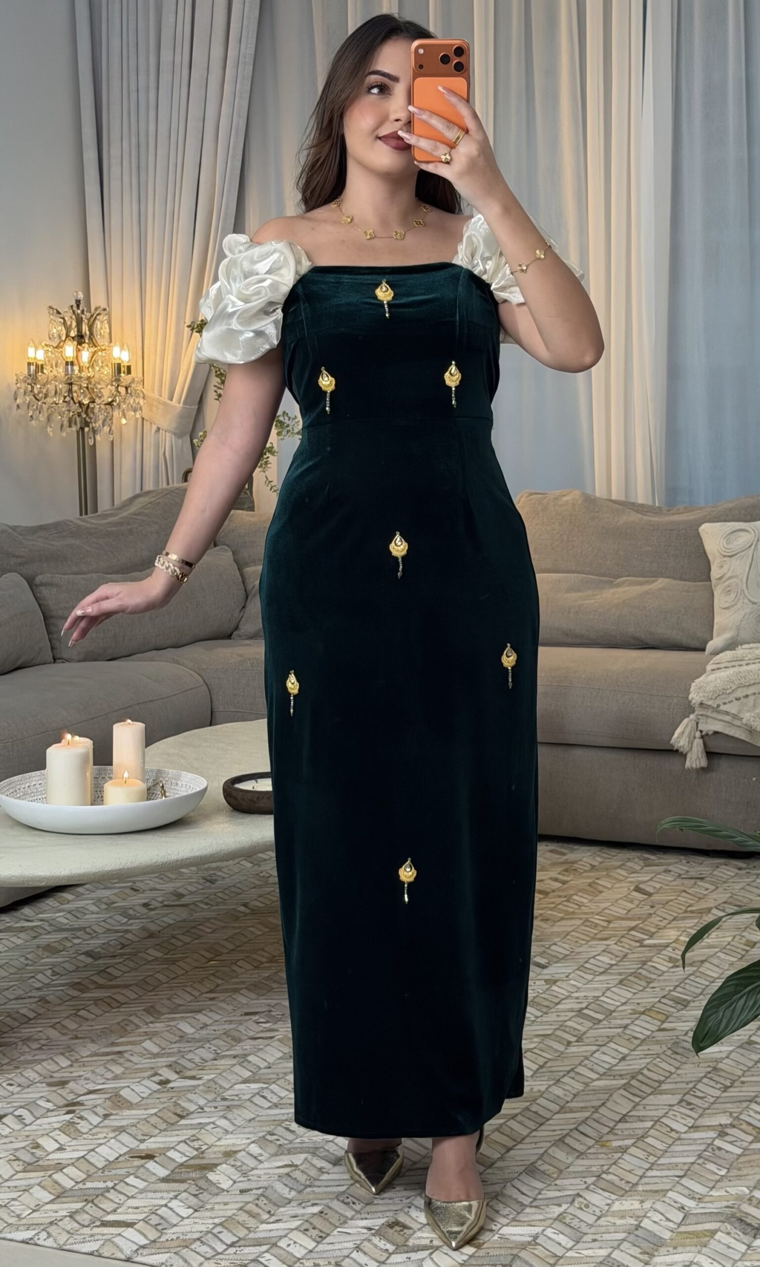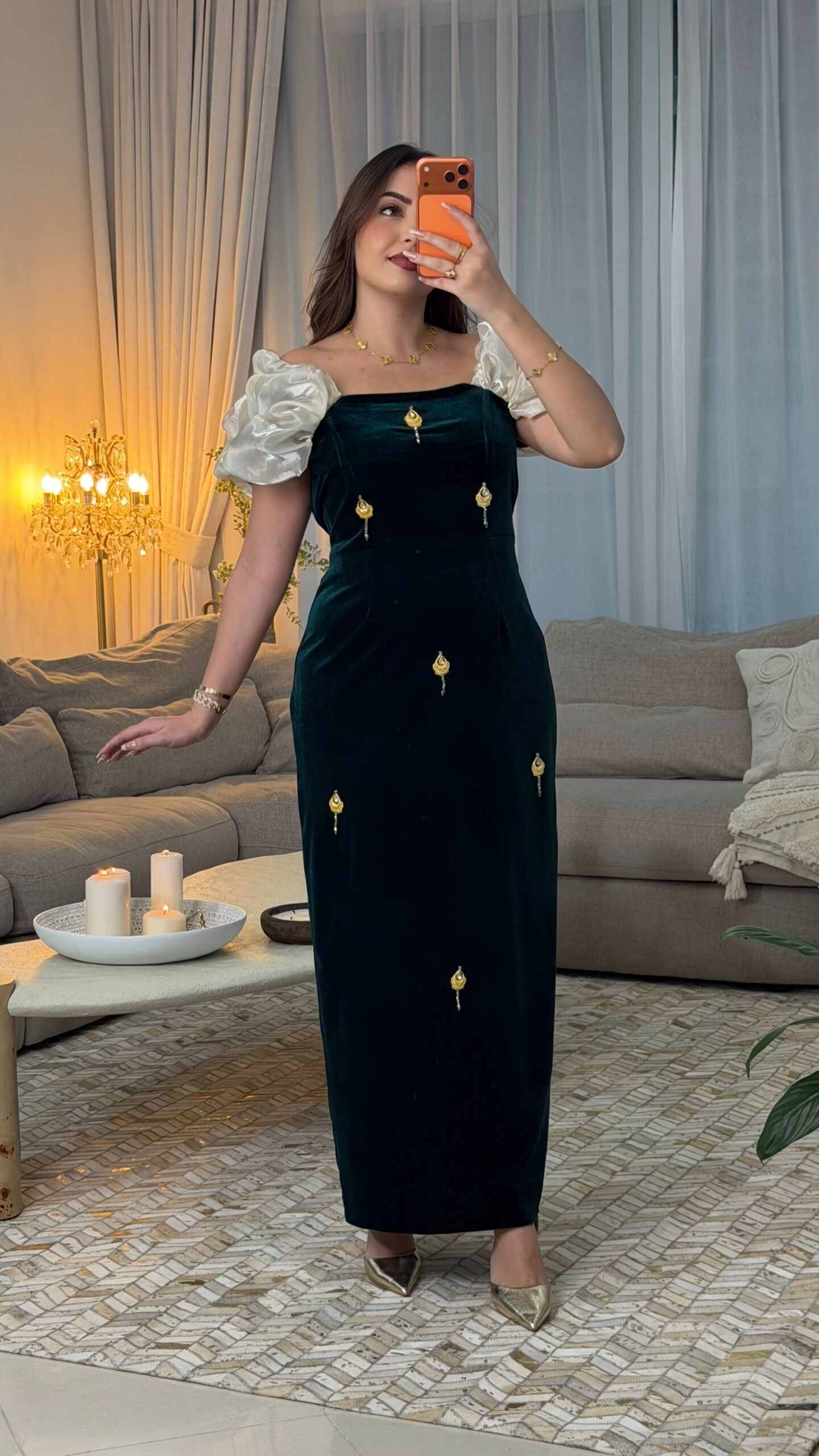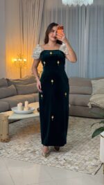 مصنوع من قماش القطيفة الفاخر الذي يعكس الأناقة في كل تفصيل، مع أكمام من الأورغانزا تضيف لمسة من النعومة والتميّز.