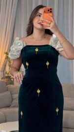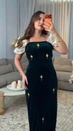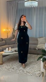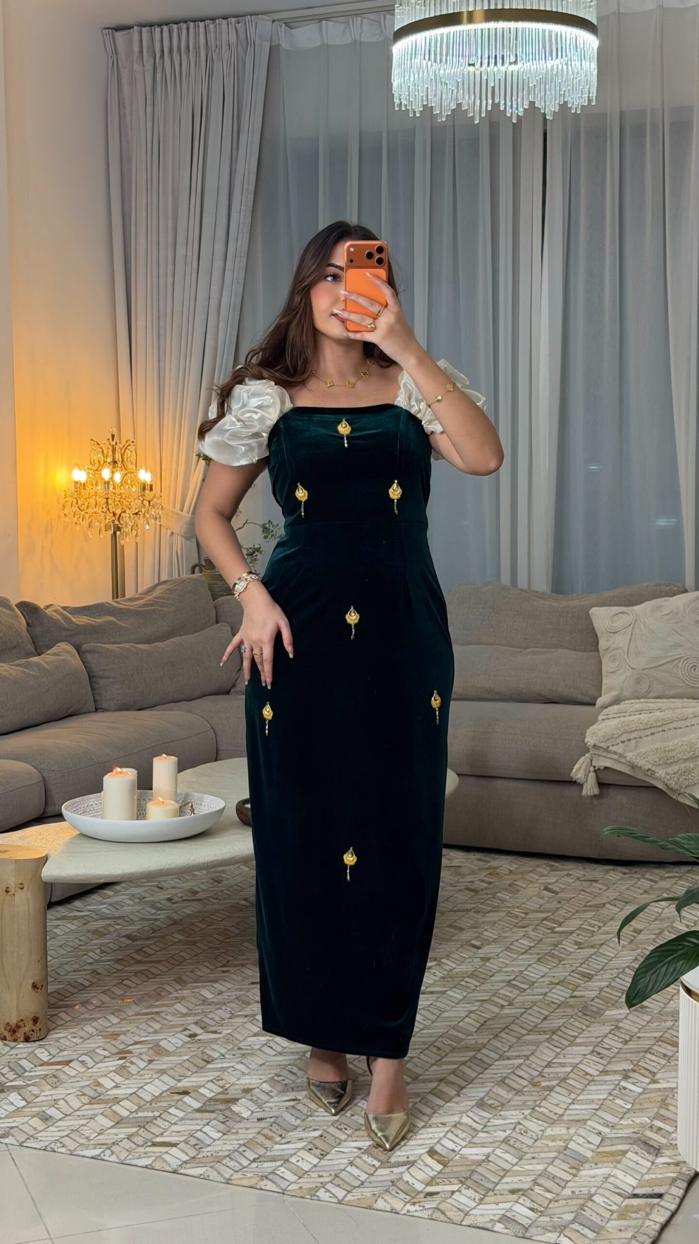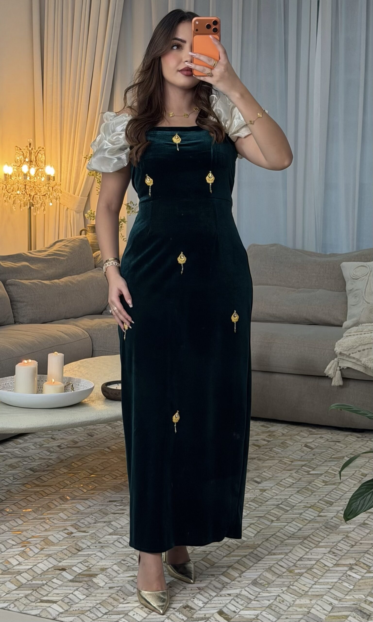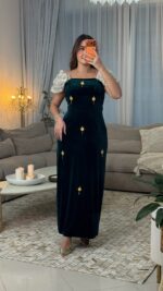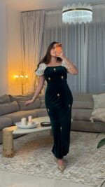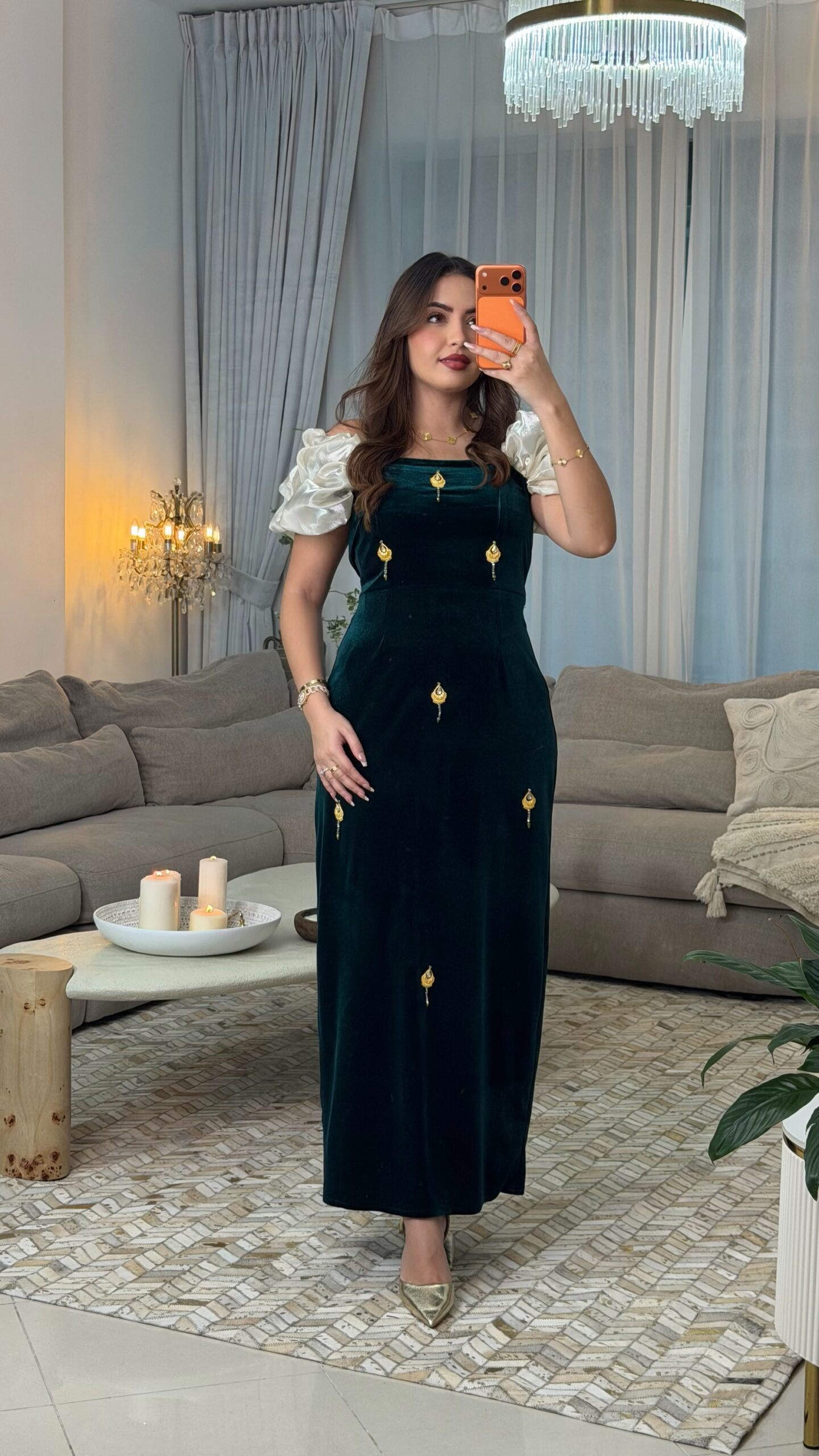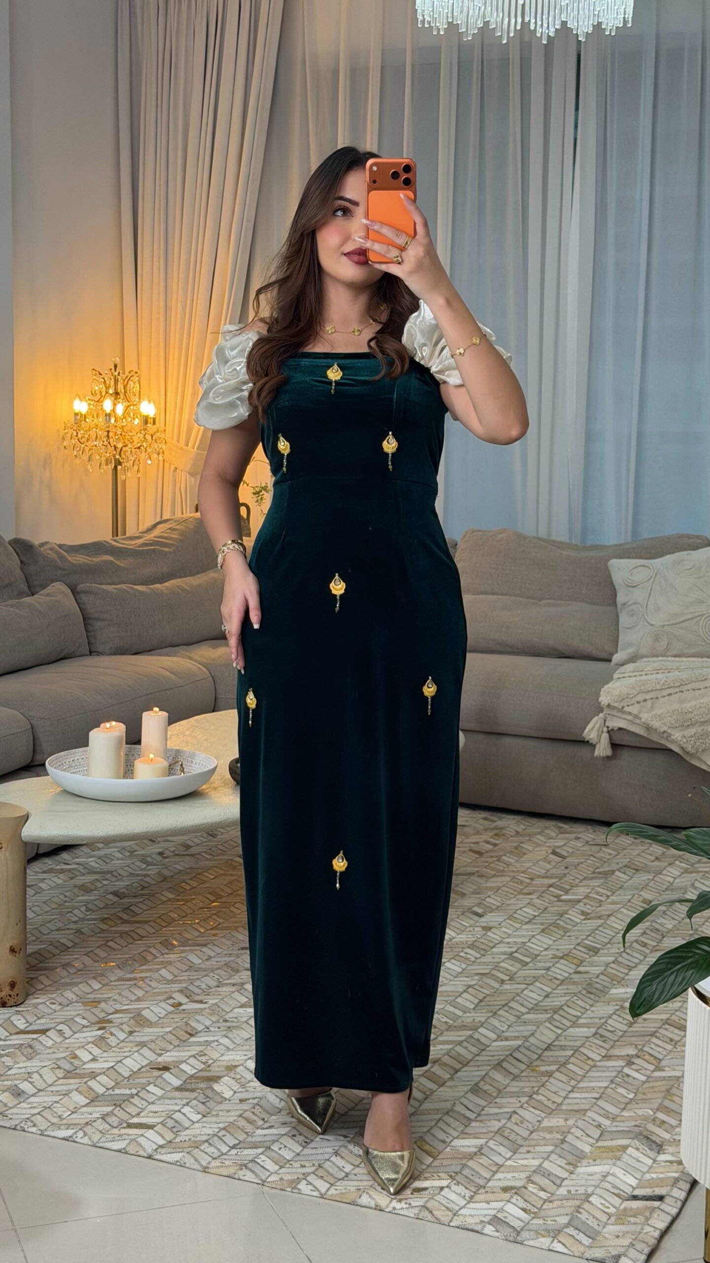 مصنوع من قماش القطيفة الفاخر الذي يعكس الأناقة في كل تفصيل، مع أكمام من الأورغانزا تضيف لمسة من النعومة والتميّز.