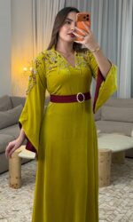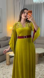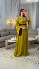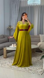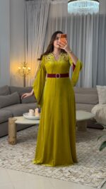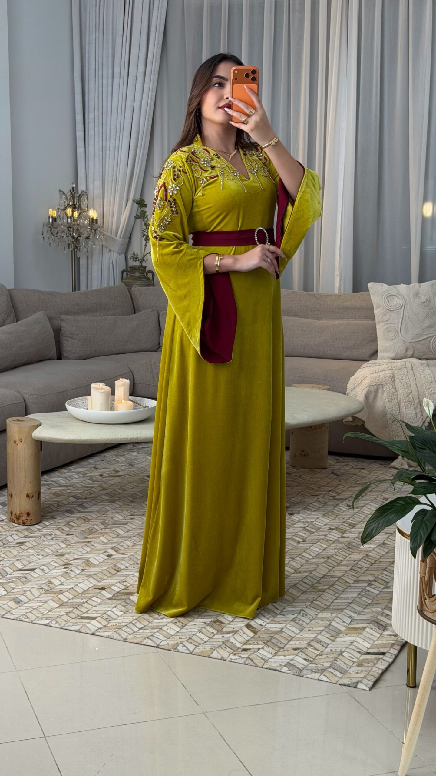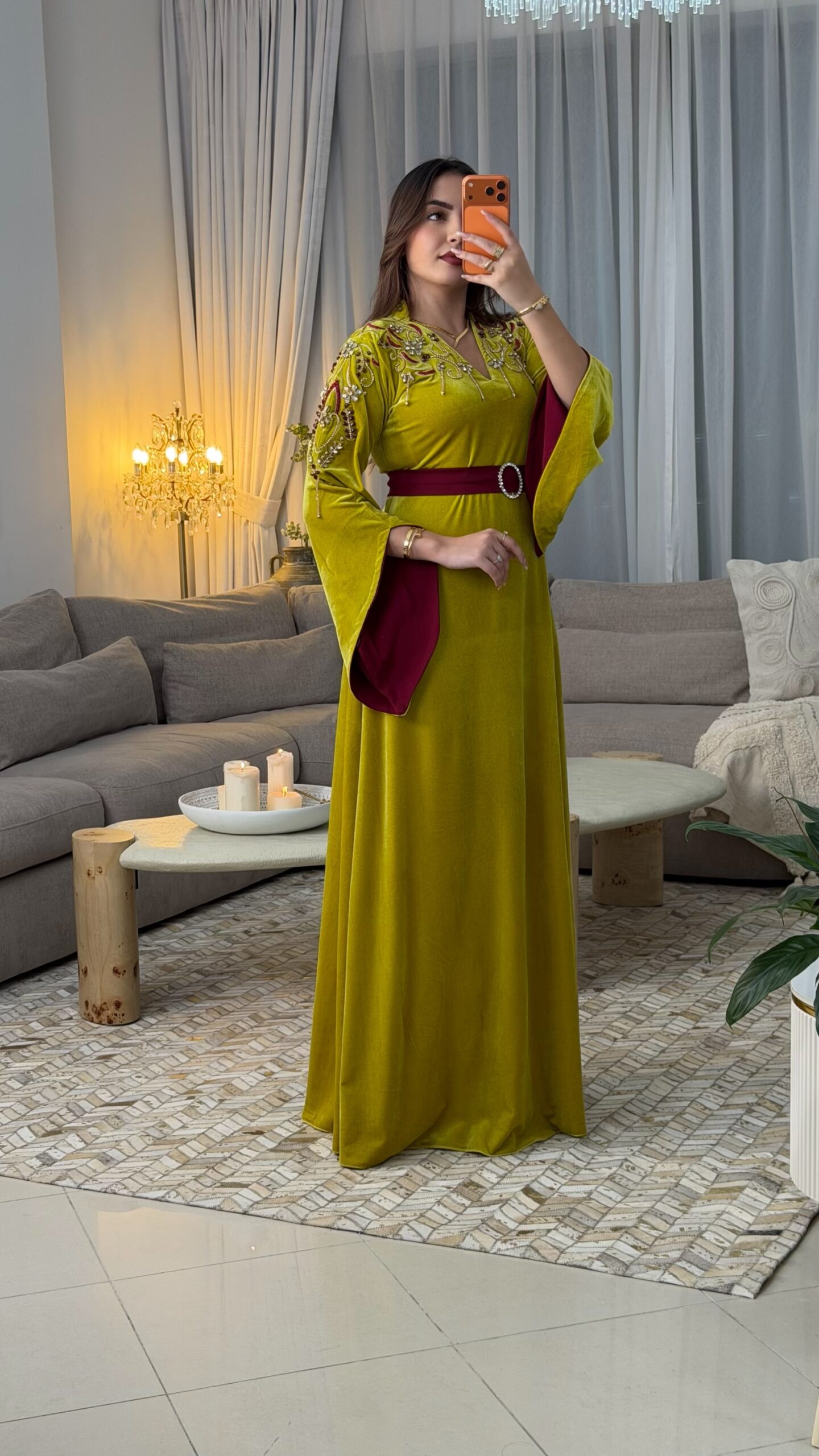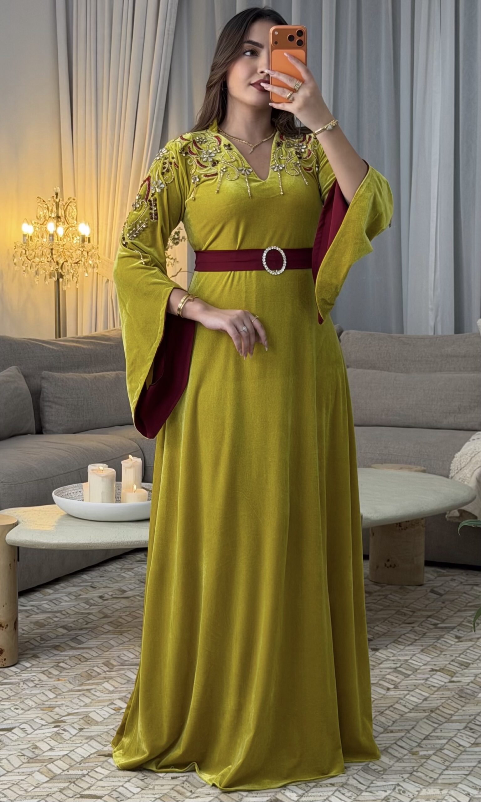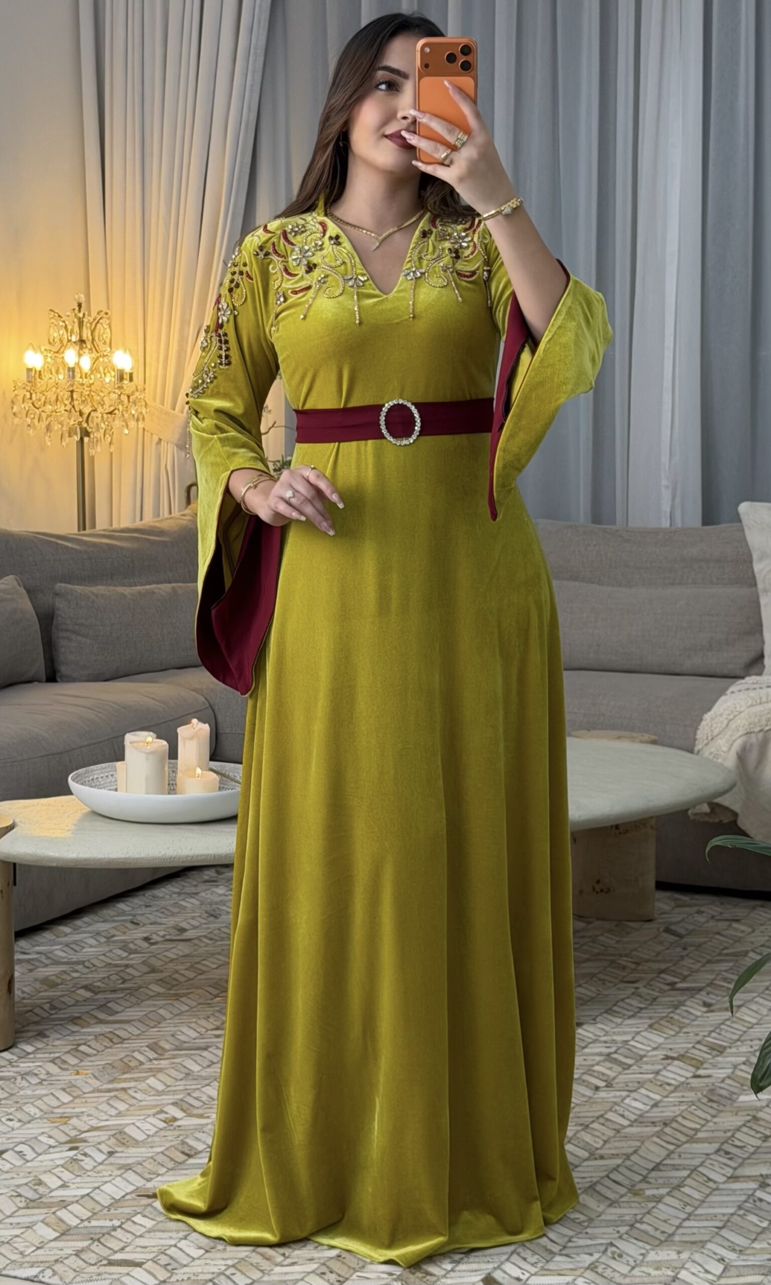 تصميم يجمع بين فخامة القطيفة الروايال ولمسة الكريب في الحزام والأكمام الداخلية، ليبرز جمال التفاصيل بحسّ أنثوي ملكي.