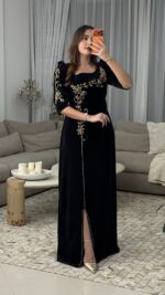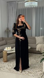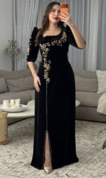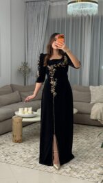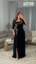 أما الأكمام فزُيّنت بتطريز متناغم يكمّل توازن الفستان، ويُربط بحزام خلفي ناعم يعزّز الخصر ويمنح لمسة أنثوية جذّابة.