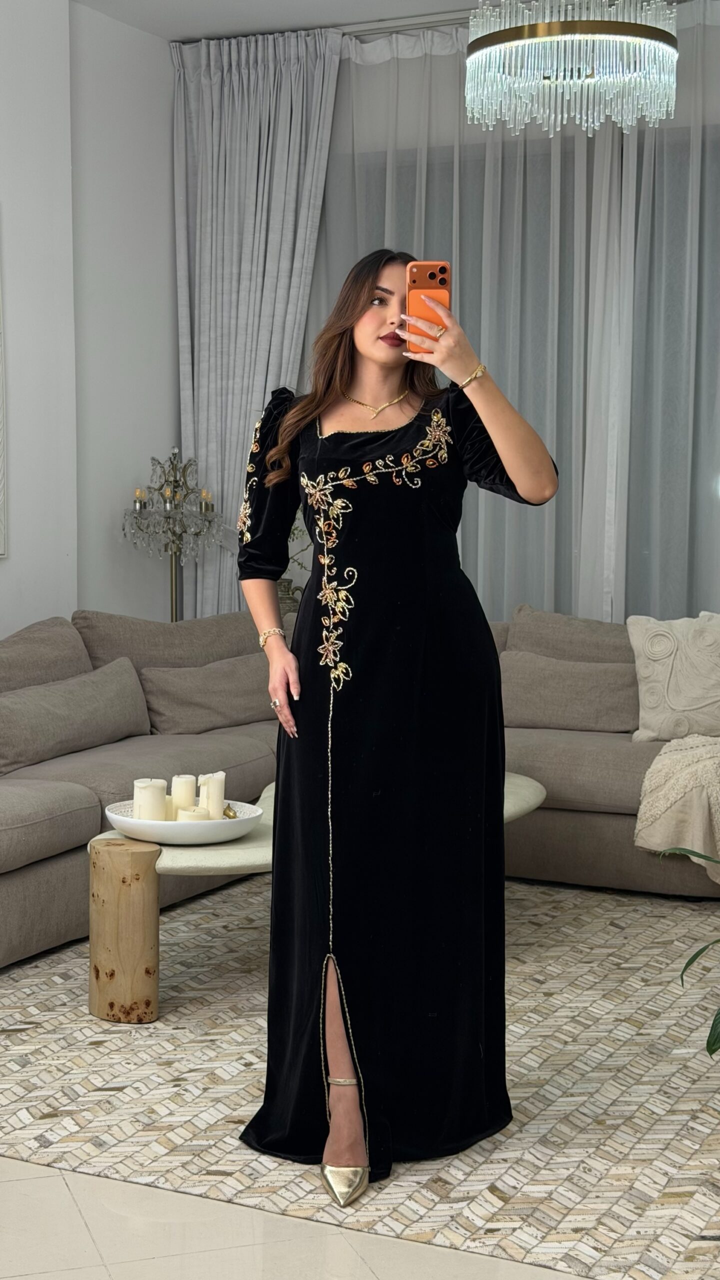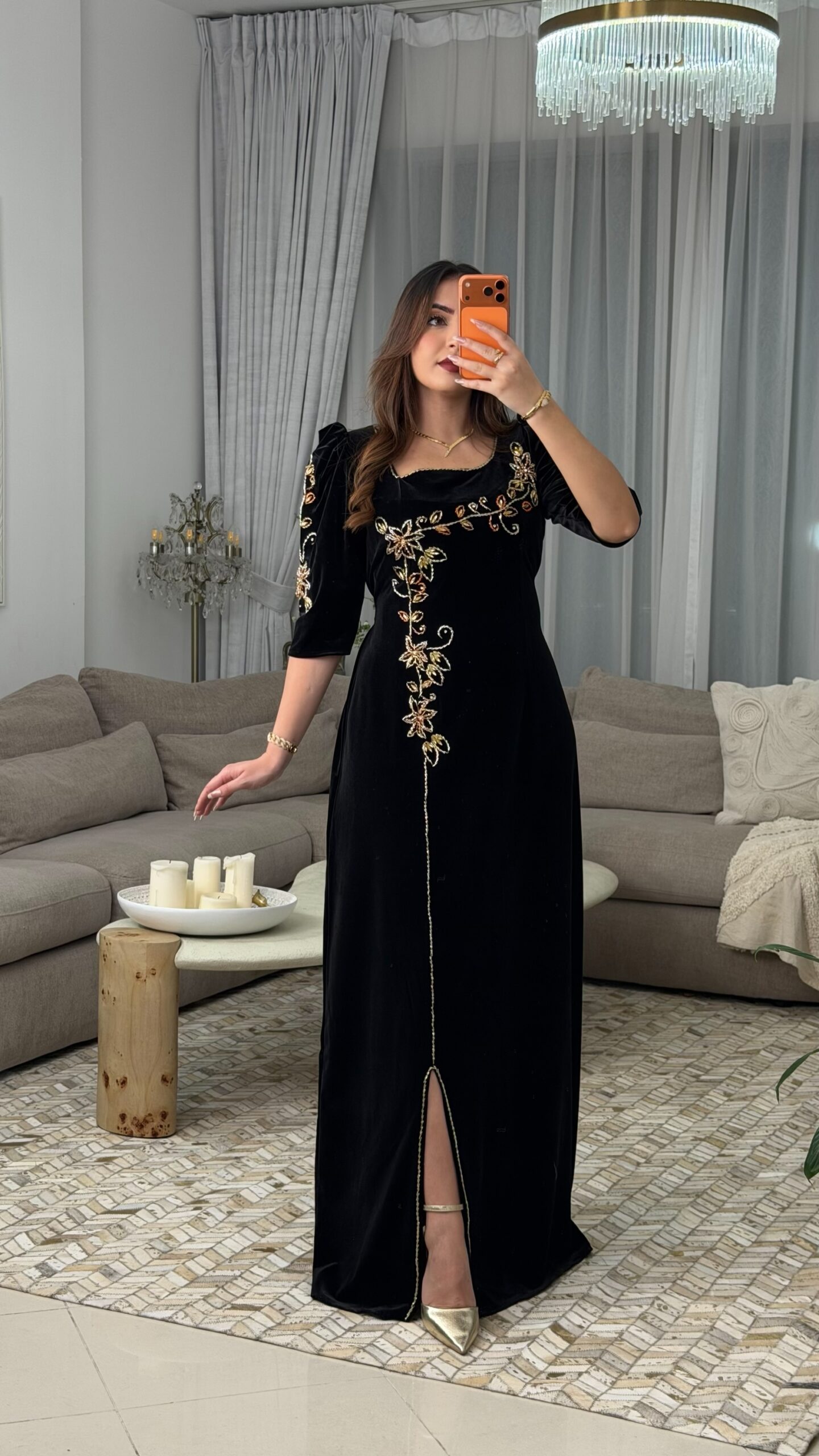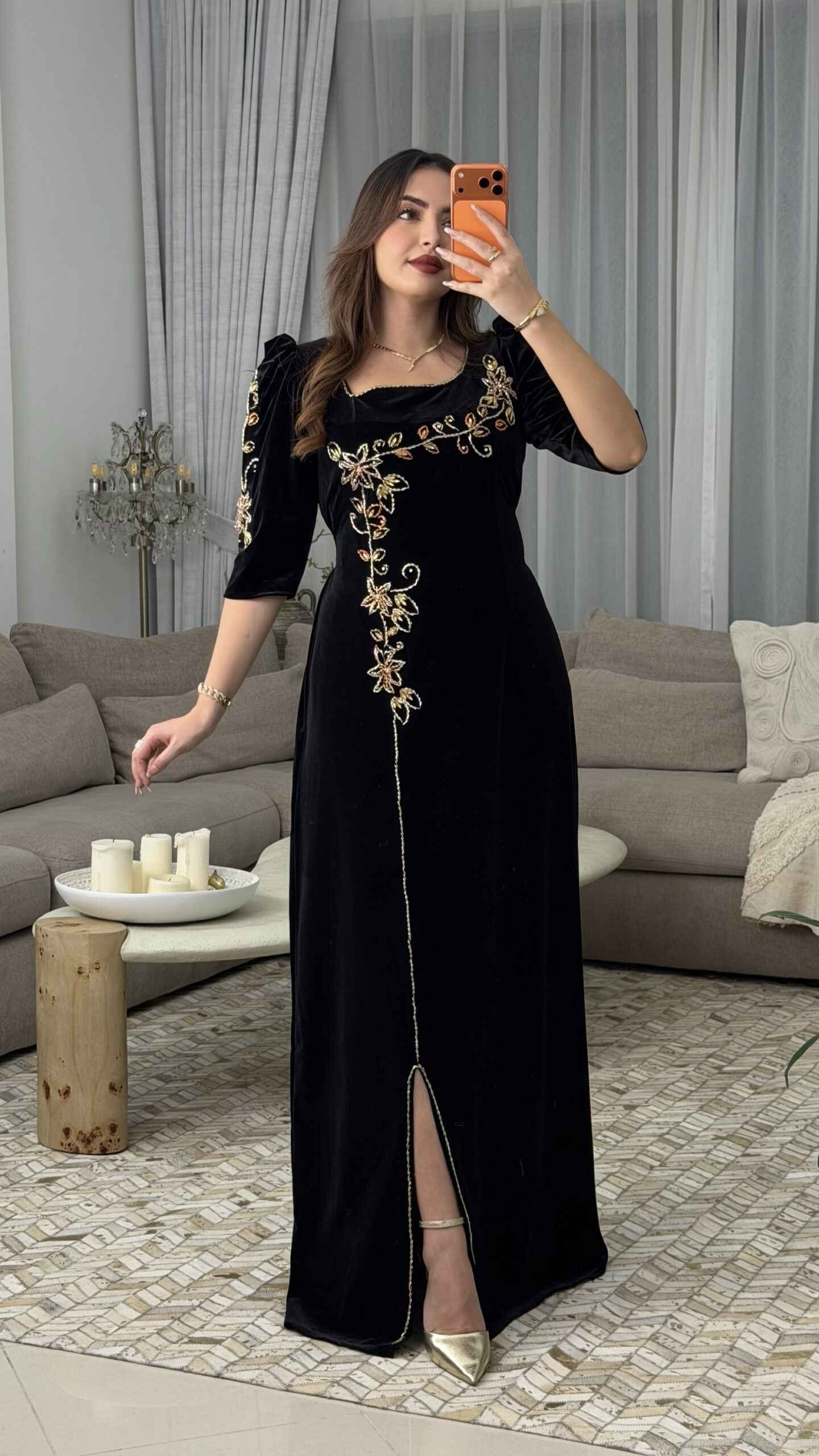 تميّزه أحجار فاخرة تم تركيبها يدويًا بدقة عالية باستخدام الإبرة والخيط، تبدأ من الصدر بانسيابية تنسدل حتى البطن، لتُبرز جمال التصميم وأناقة القوام.