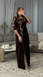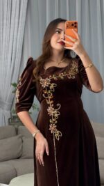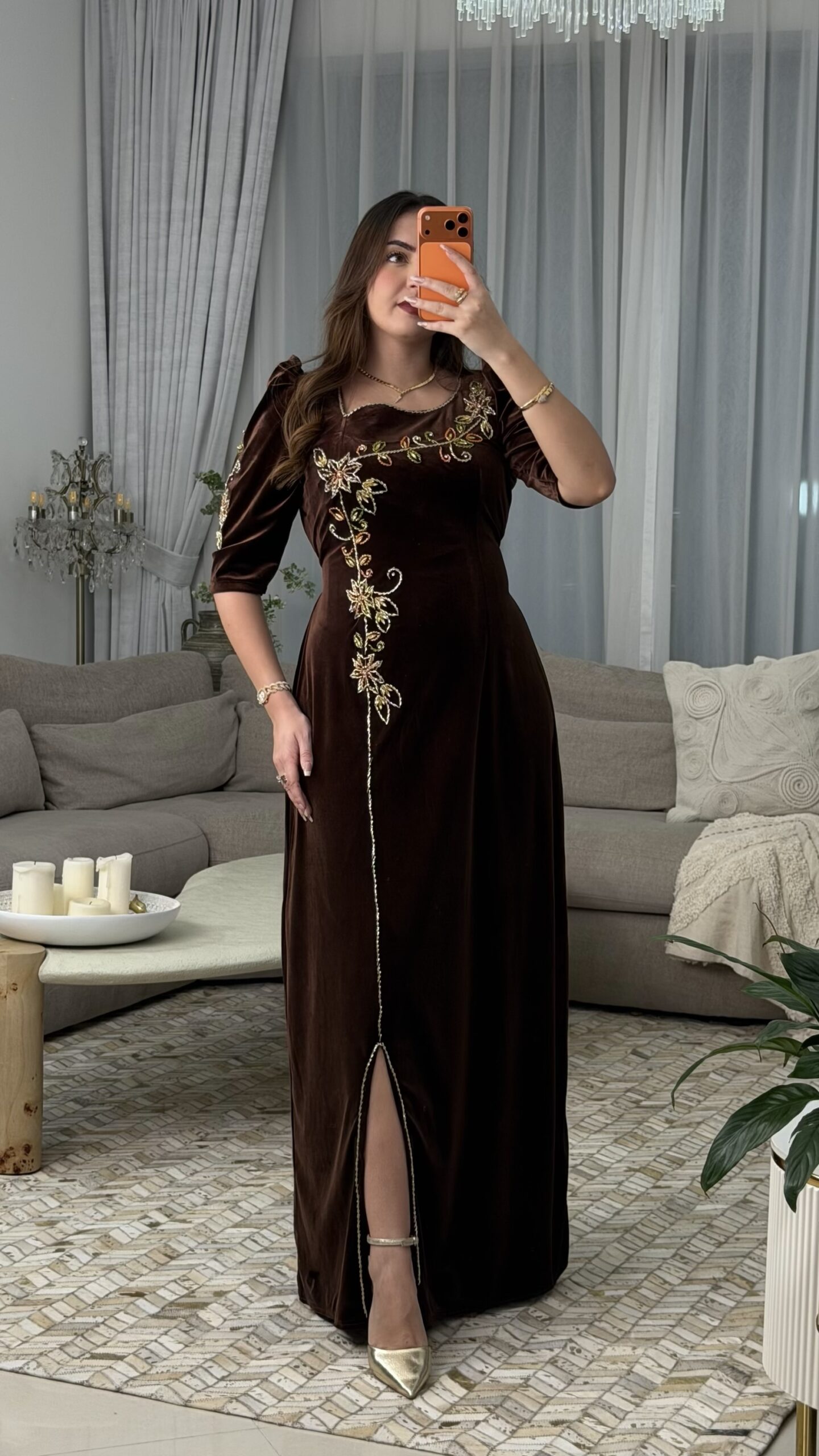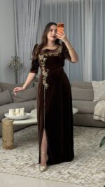 أما الأكمام فزُيّنت بتطريز متناغم يكمّل توازن الفستان، ويُربط بحزام خلفي ناعم يعزّز الخصر ويمنح لمسة أنثوية جذّابة.