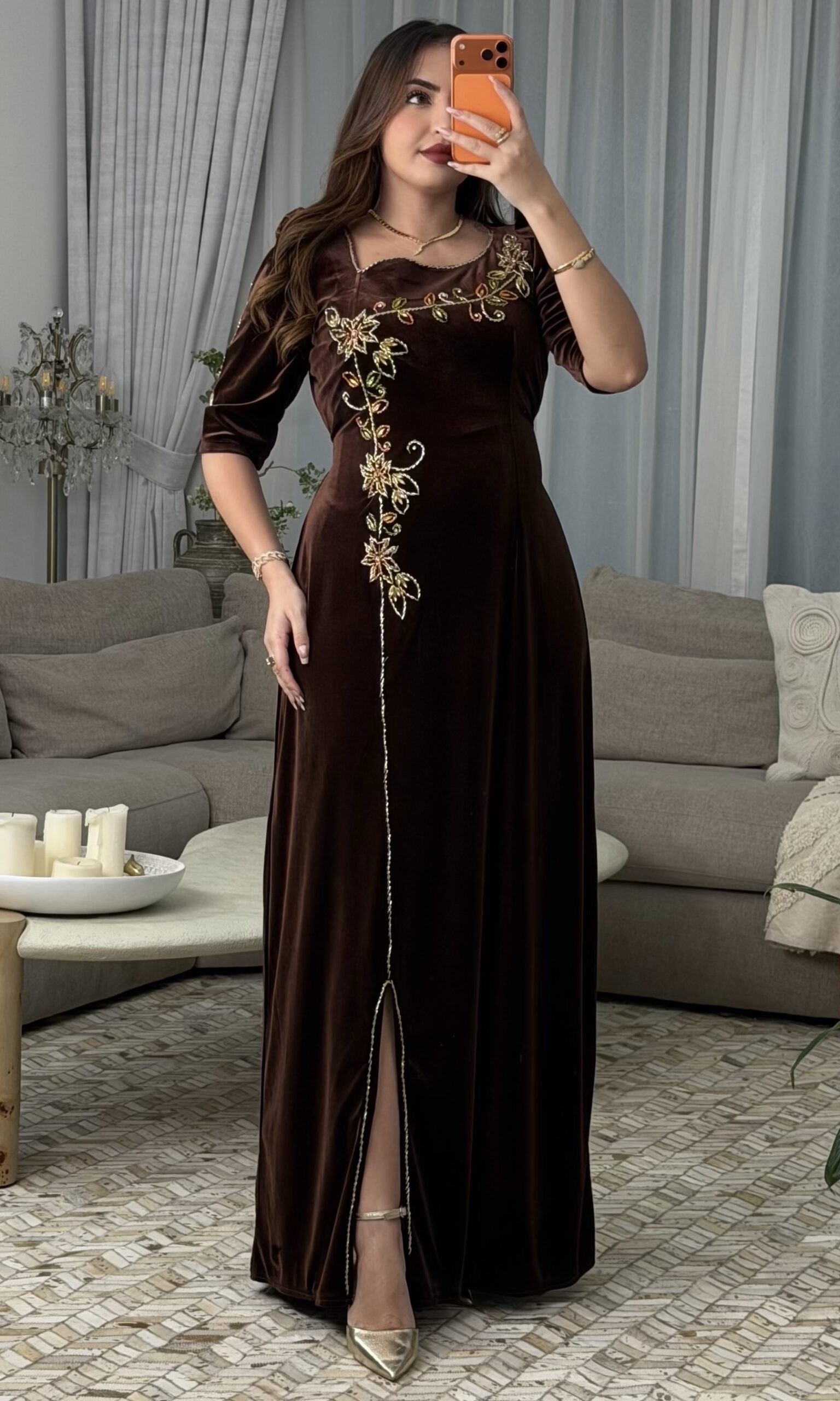 تميّزه أحجار فاخرة تم تركيبها يدويًا بدقة عالية باستخدام الإبرة والخيط، تبدأ من الصدر بانسيابية تنسدل حتى البطن، لتُبرز جمال التصميم وأناقة القوام.