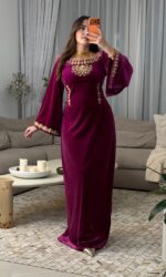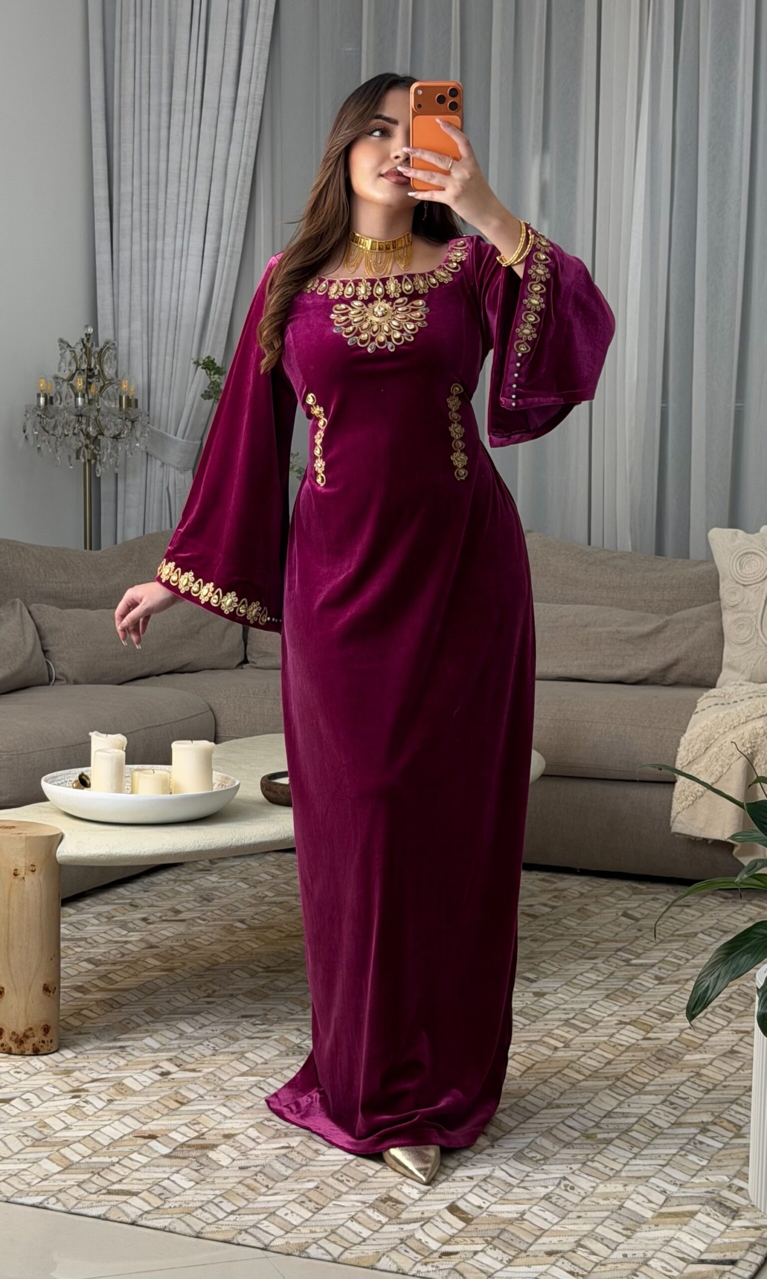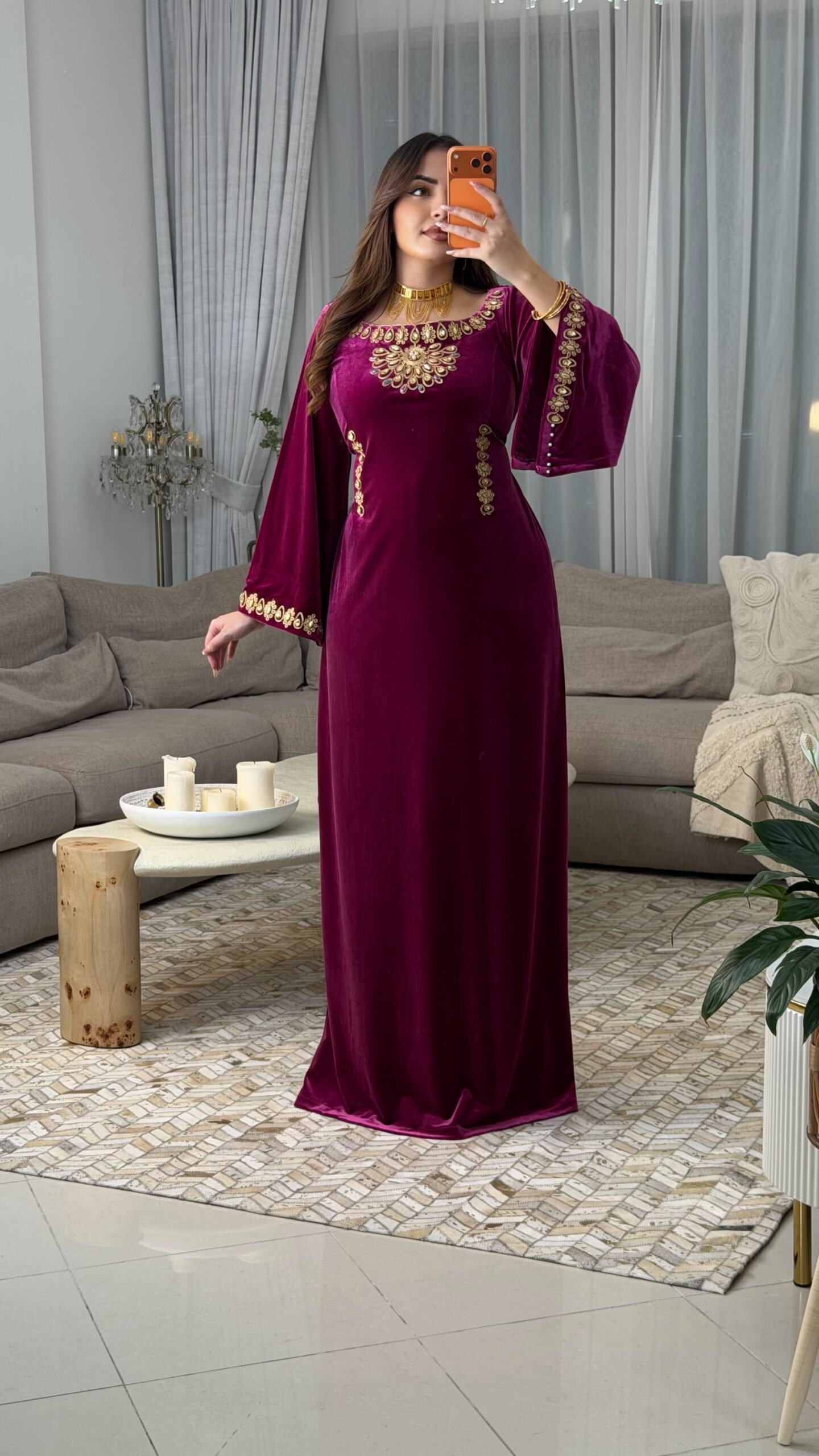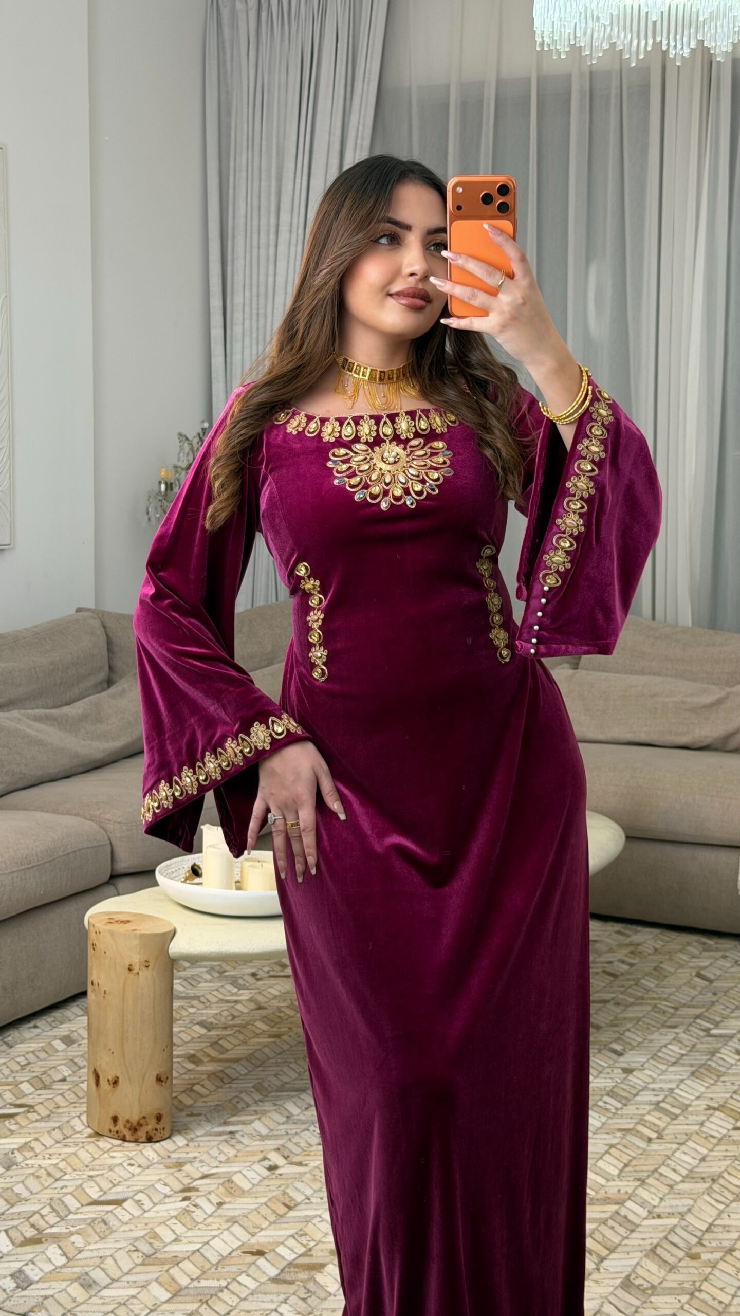 يُجسّد هذا الفستان مزيجًا من الفخامة والأصالة بتصميمه الراقي من قماش القطيفة الفاخر بلونه الأحمر القاني العميق.