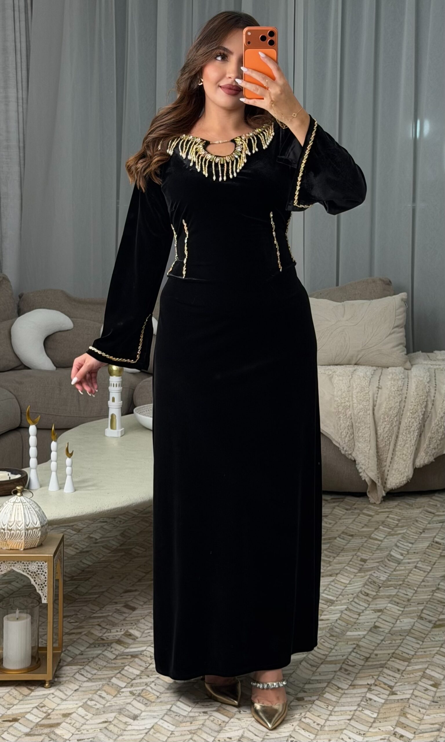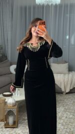 فستان Glamour يجسّد معنى الأناقة والرقي، مصنوع من قماش القطيفة روايال الناعم والفاخر، بقصة أنثوية تبرز القوام بكل أناقة.