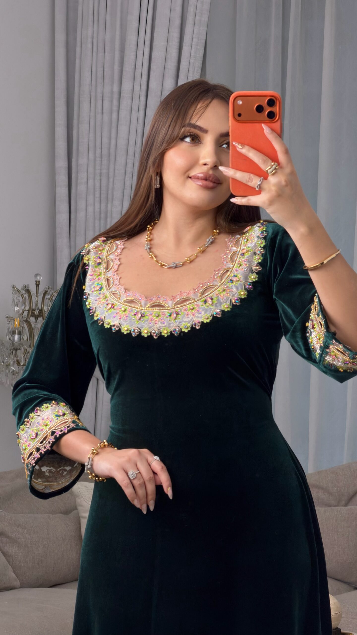 كما زُيّن التطريز بـ أحجار أصلية مختارة بعناية لتبرز جمال التفاصيل وتزيده فخامة.