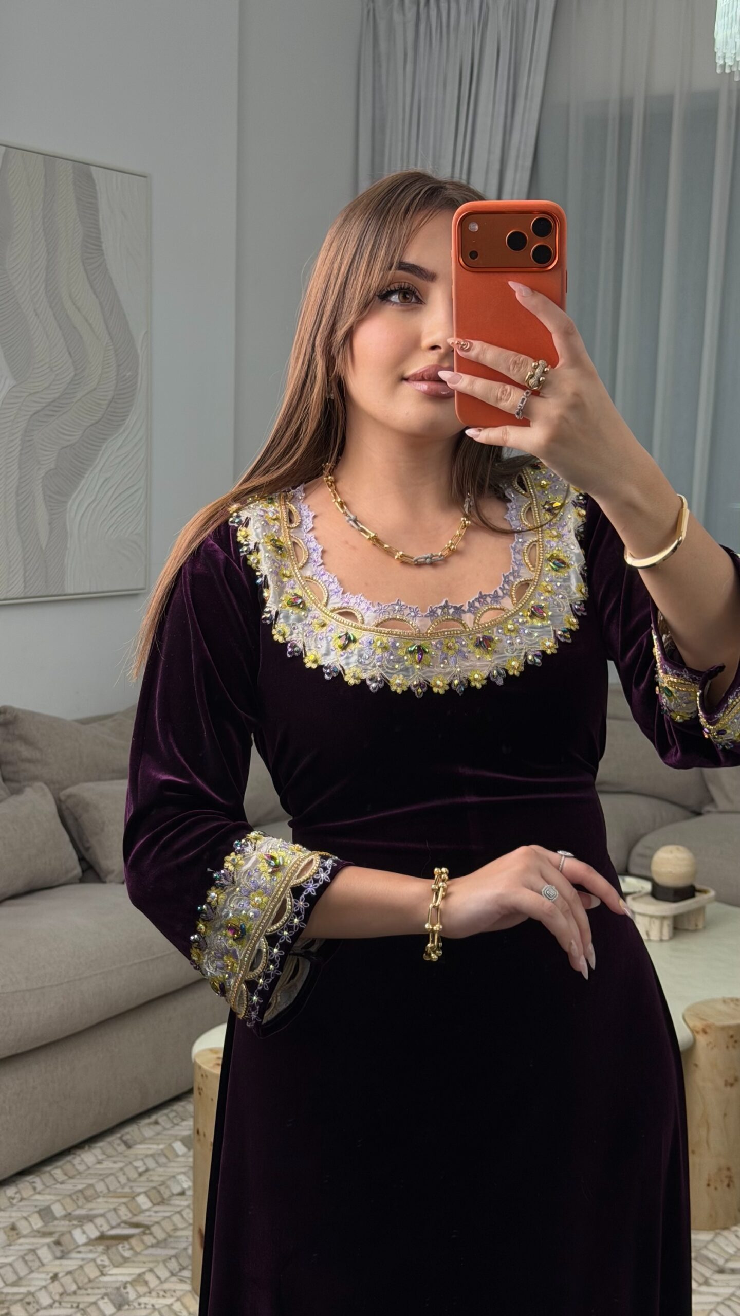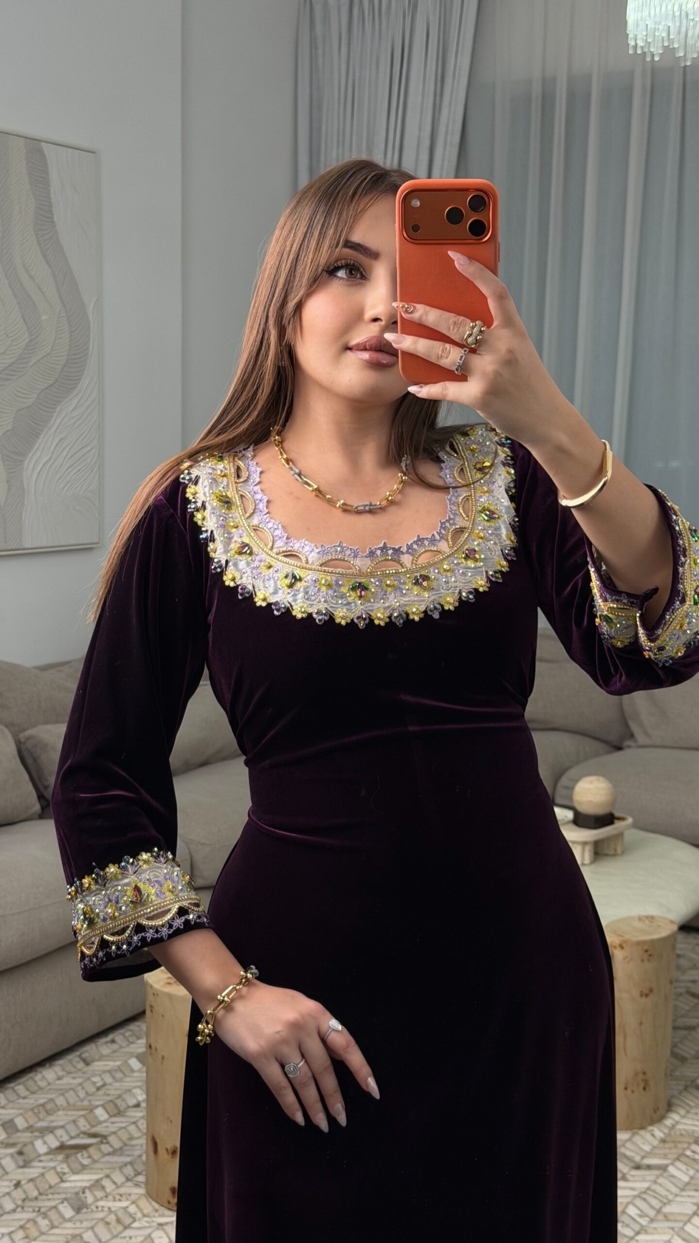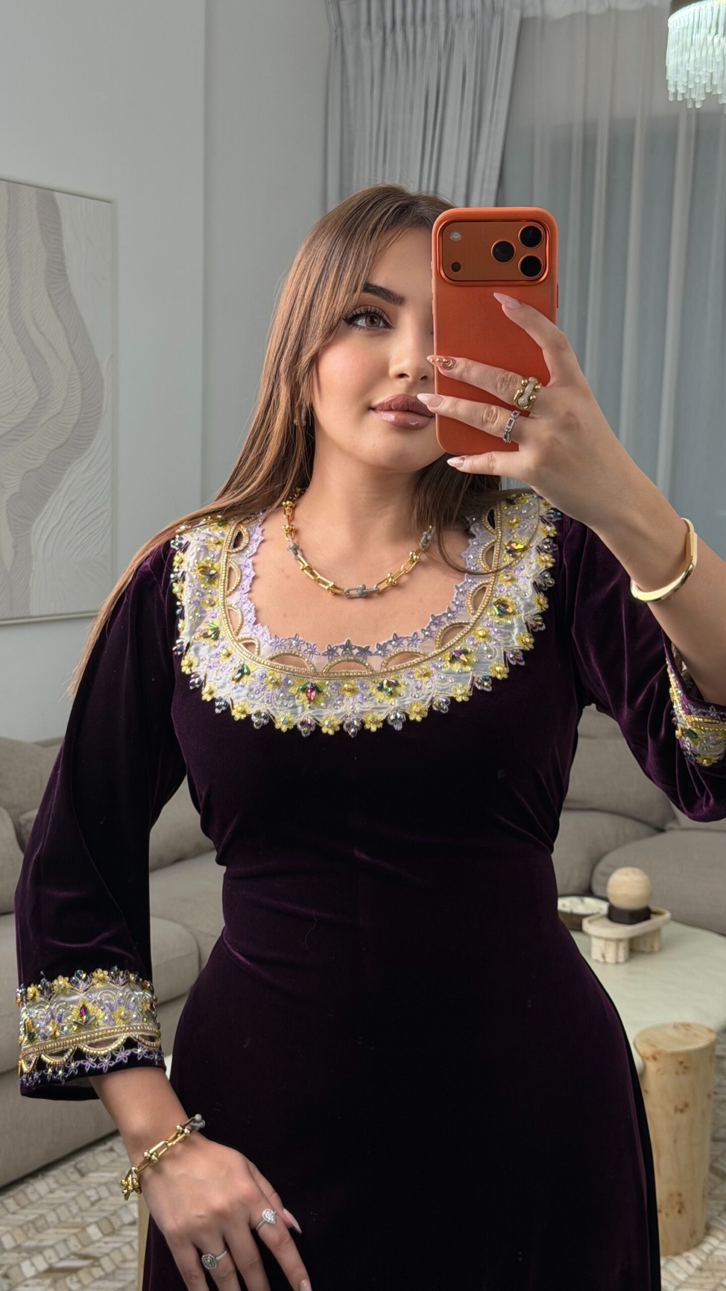 كما زُيّن التطريز بـ أحجار أصلية مختارة بعناية لتبرز جمال التفاصيل وتزيده فخامة.