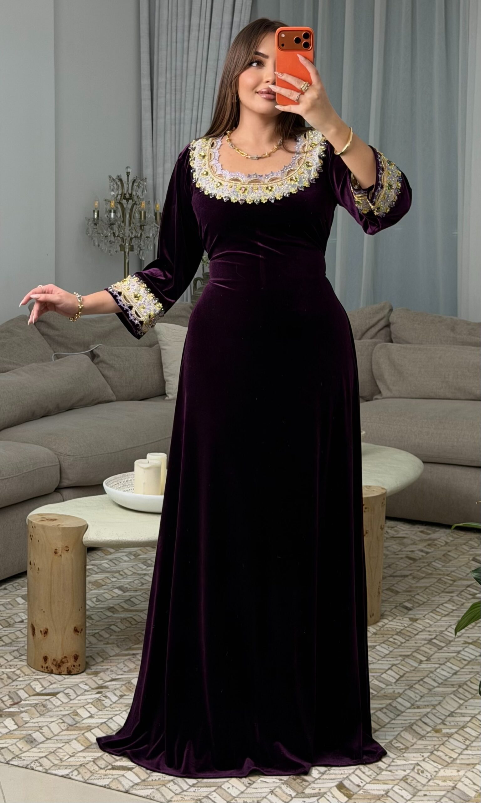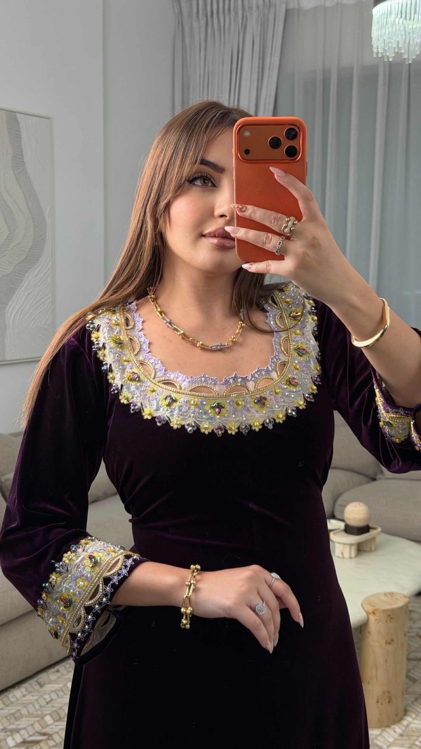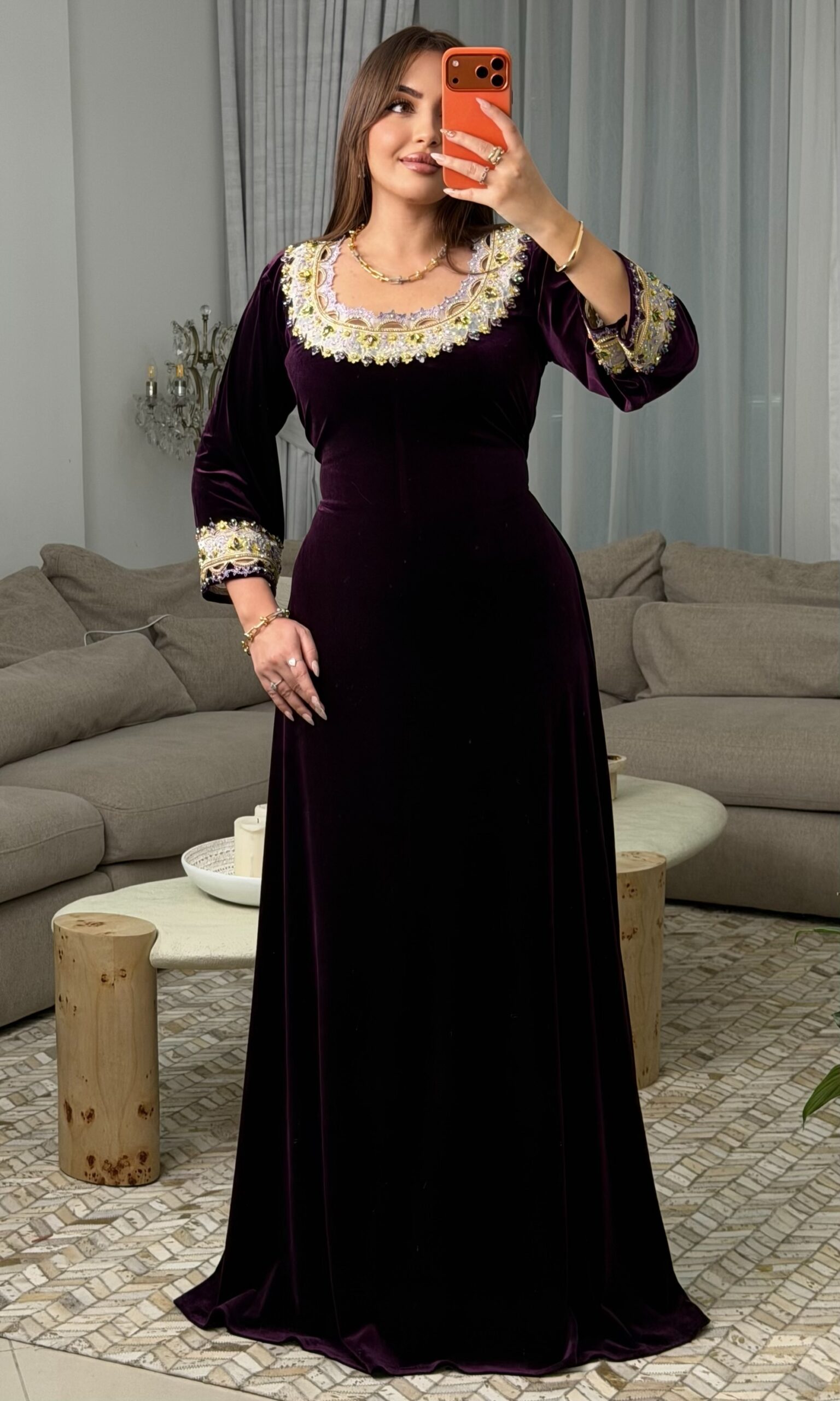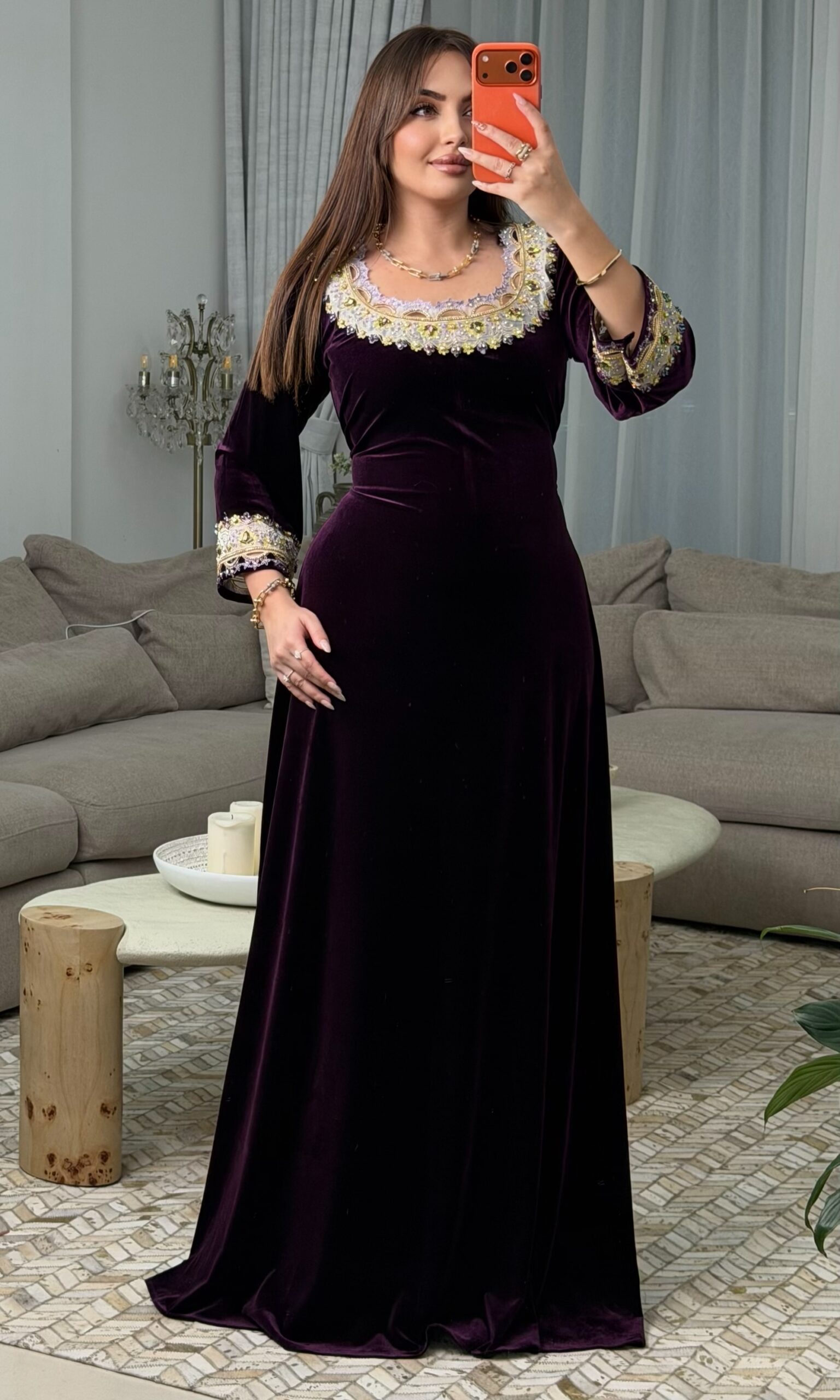 كما زُيّن التطريز بـ أحجار أصلية مختارة بعناية لتبرز جمال التفاصيل وتزيده فخامة.