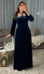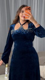 مع تصميم يربط في الرقبة ليبرز جمال العنق ويمنح الفستان طابعًا أنثويًا جذابًا.