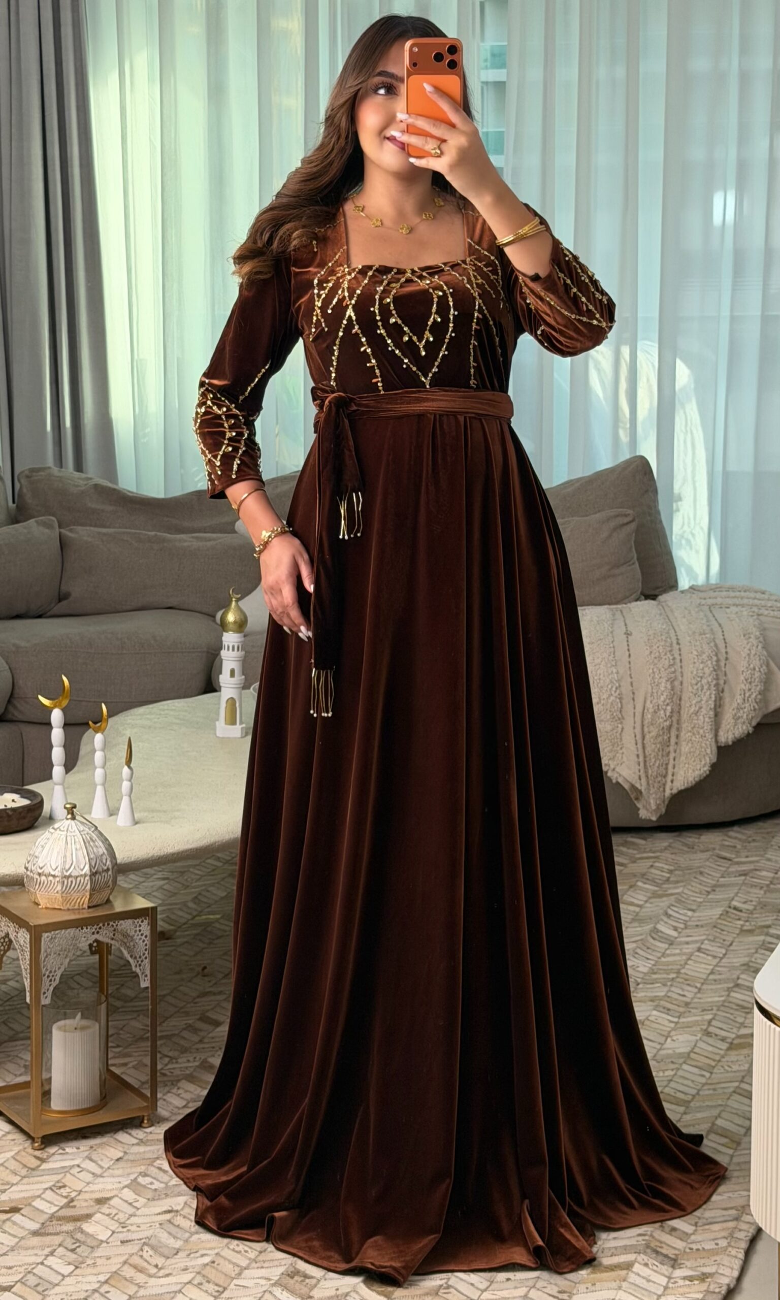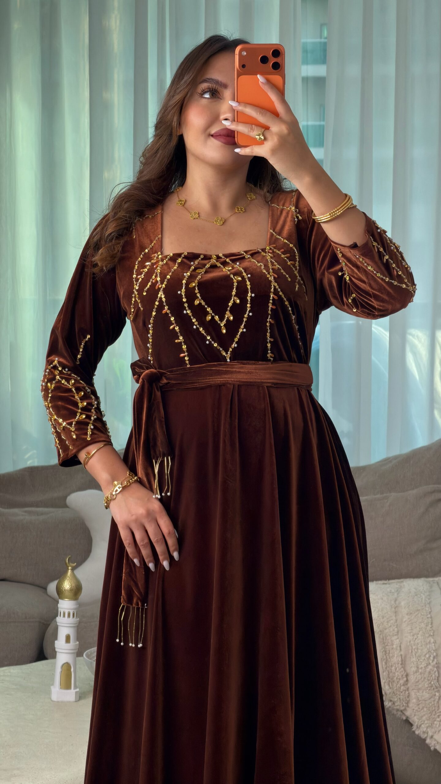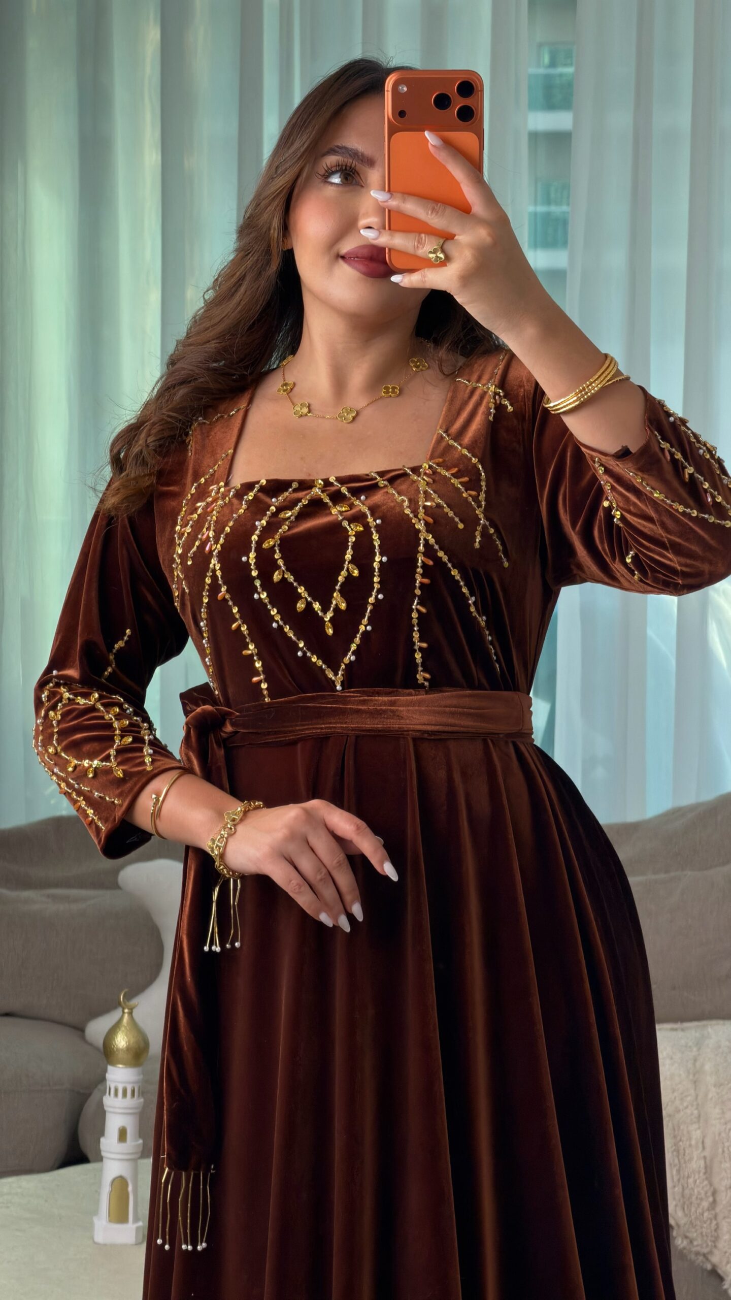 مصنوع من قماش القطيفة الفاخر الذي يمنح نعومة ولمعة راقية، وتم تصميم الصدر والظهر على شكل أجنحة متناظرة تعكس إحساس الحرية والرقي، بنفس الدقة والعمل الفني في الجهتين.