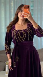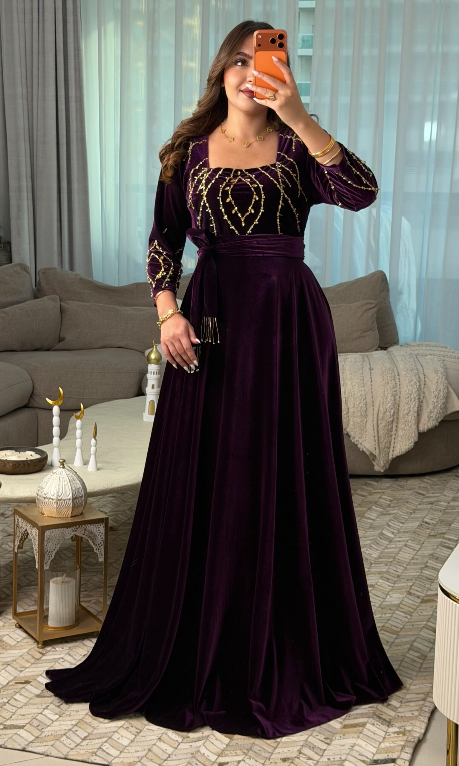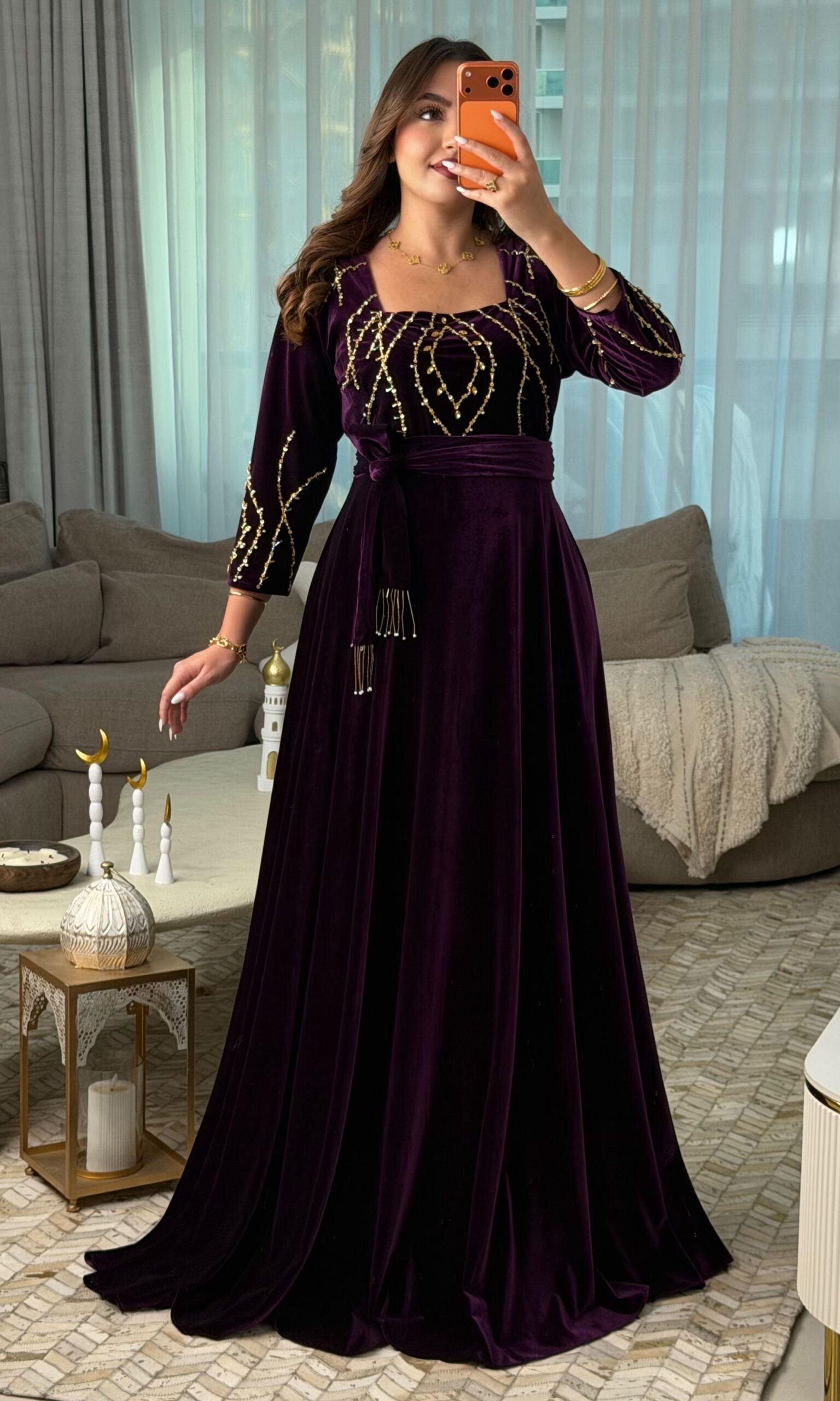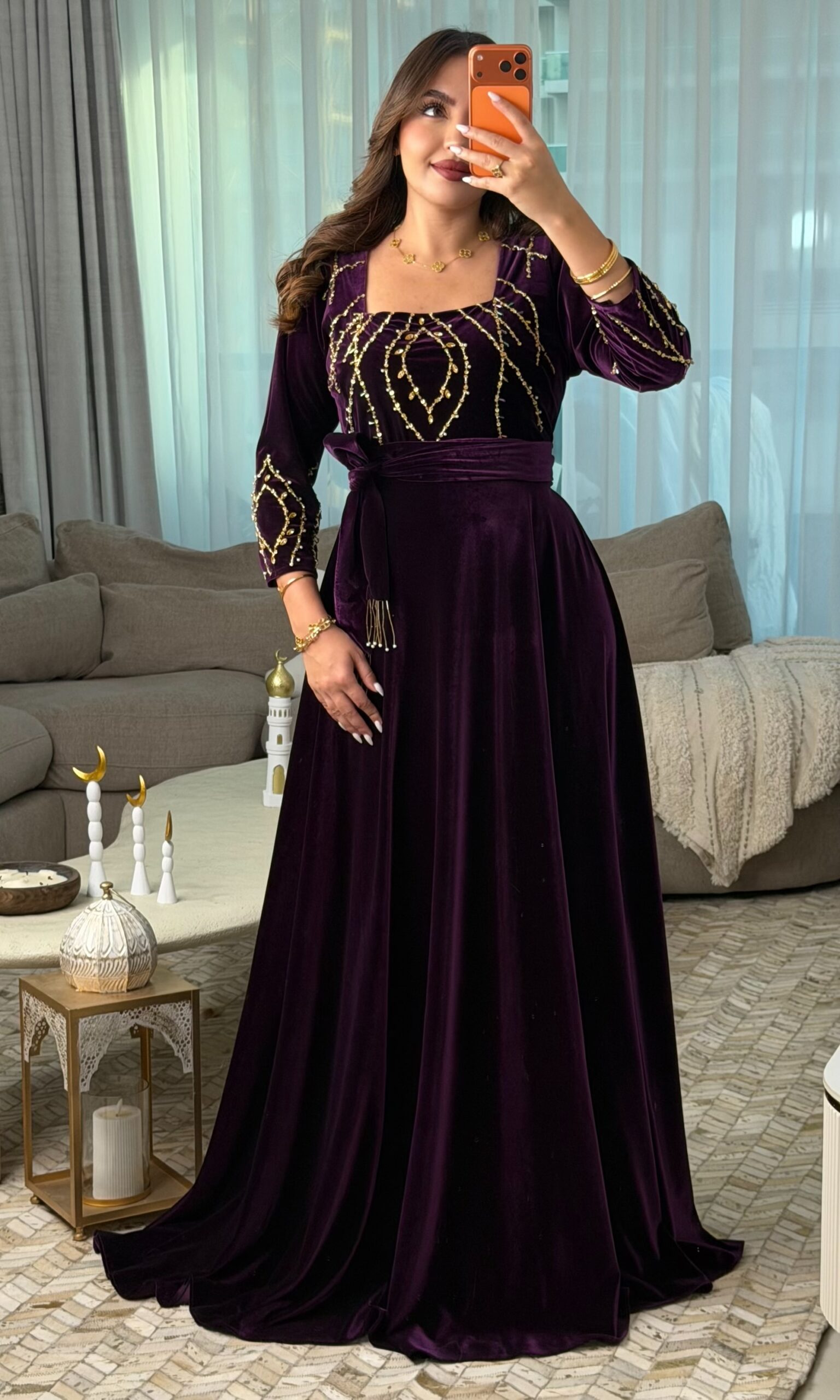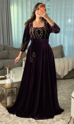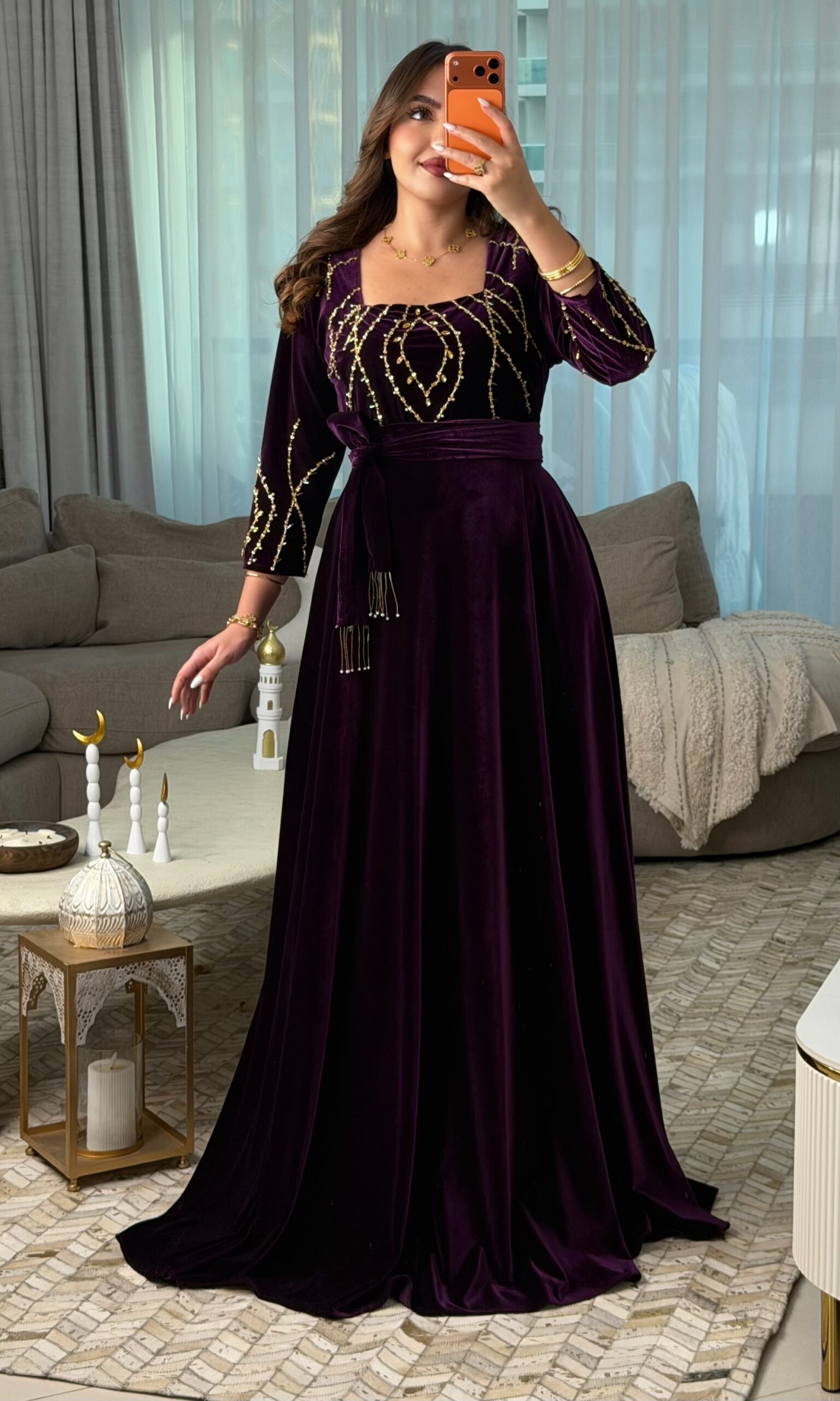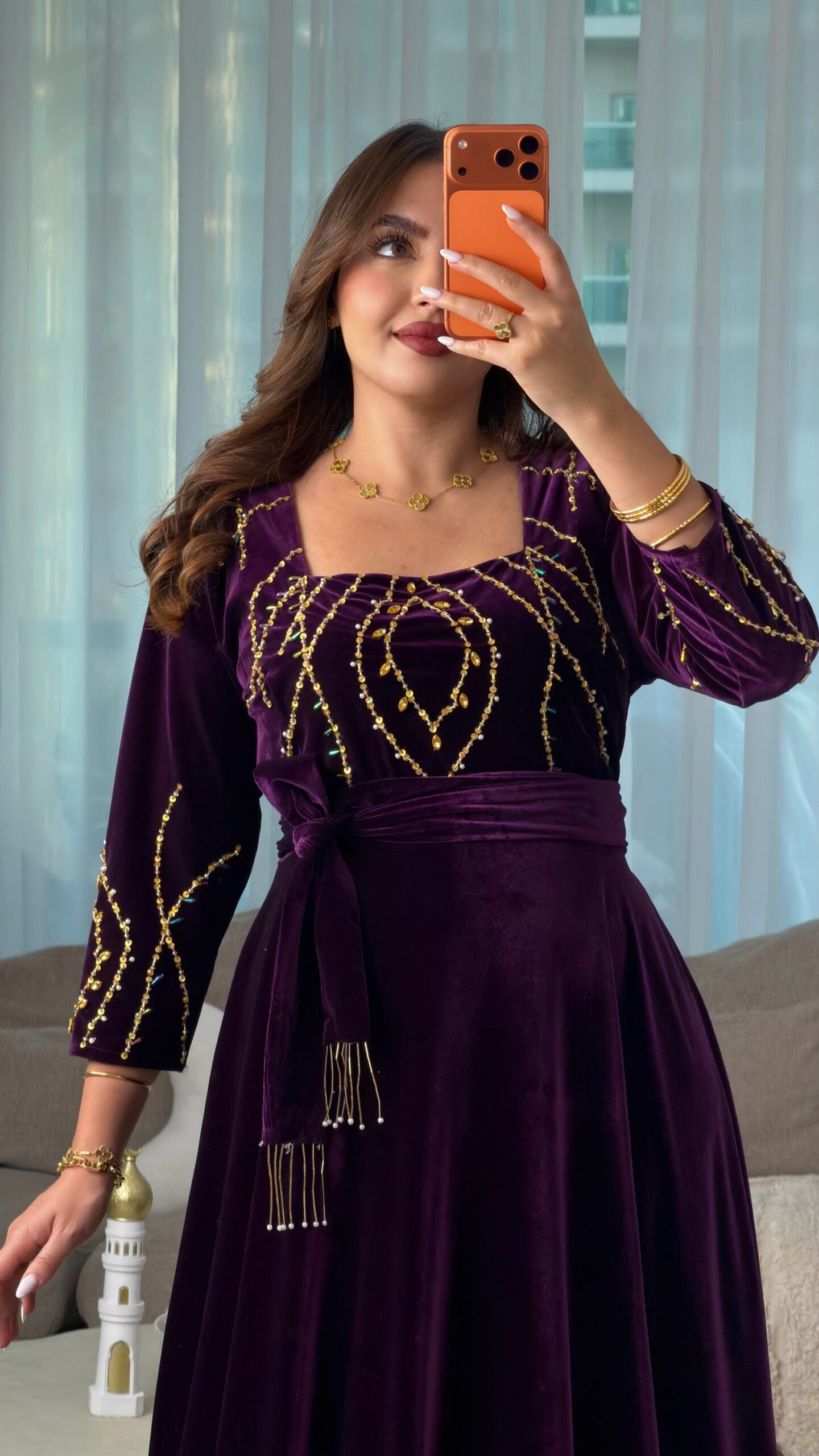 مصنوع من قماش القطيفة الفاخر الذي يمنح نعومة ولمعة راقية، وتم تصميم الصدر والظهر على شكل أجنحة متناظرة تعكس إحساس الحرية والرقي، بنفس الدقة والعمل الفني في الجهتين.