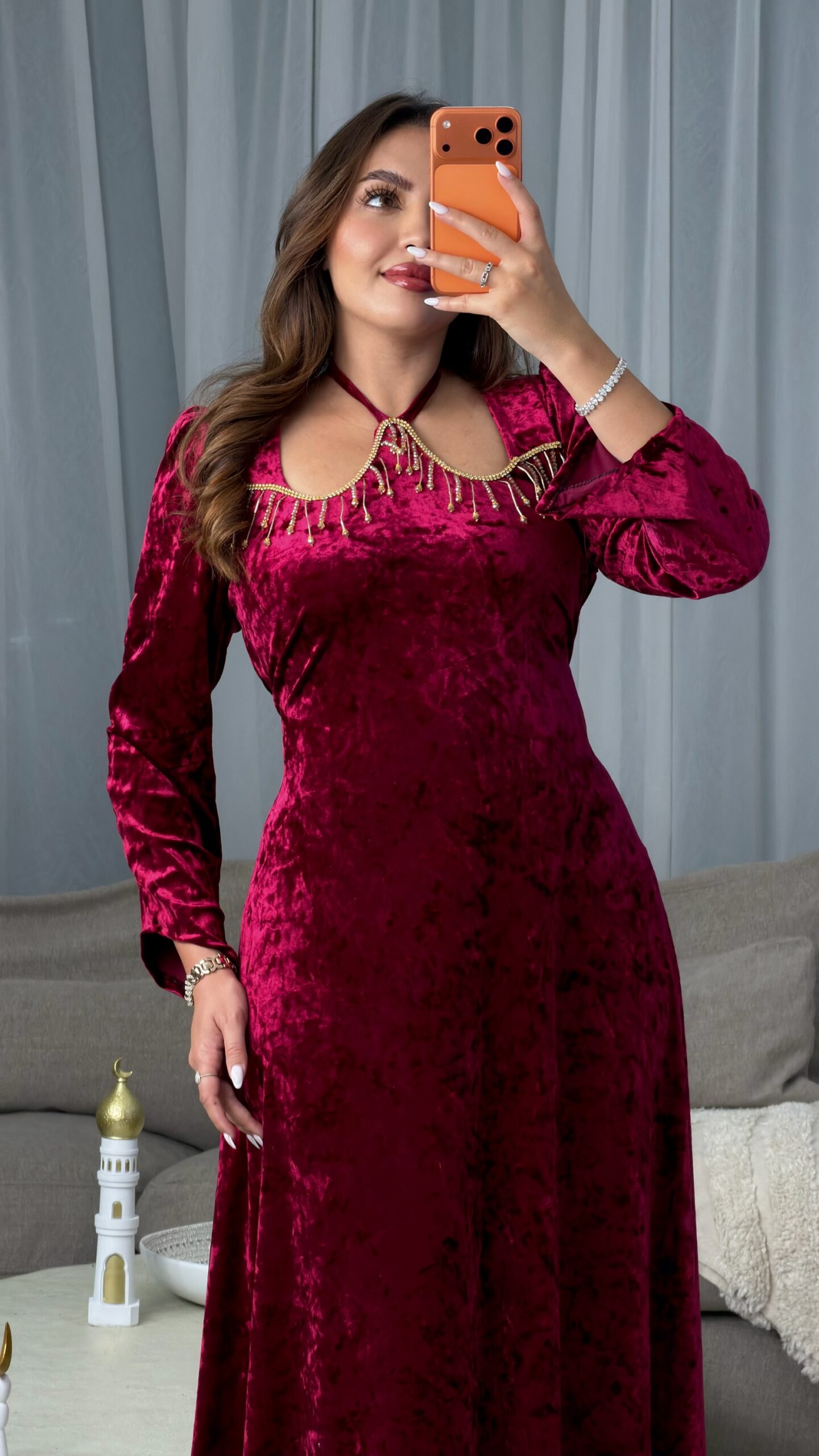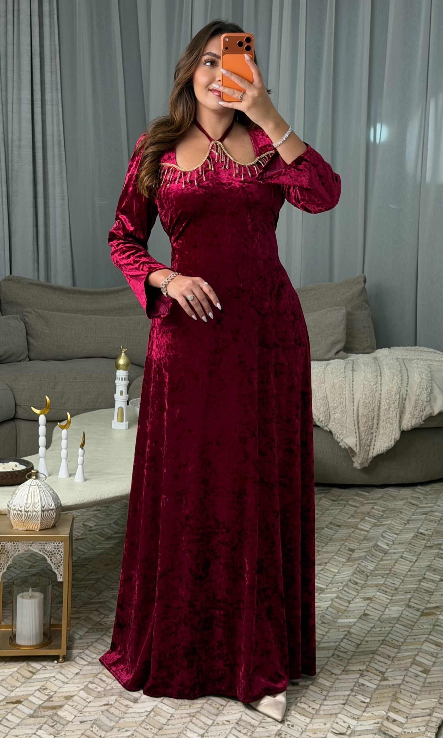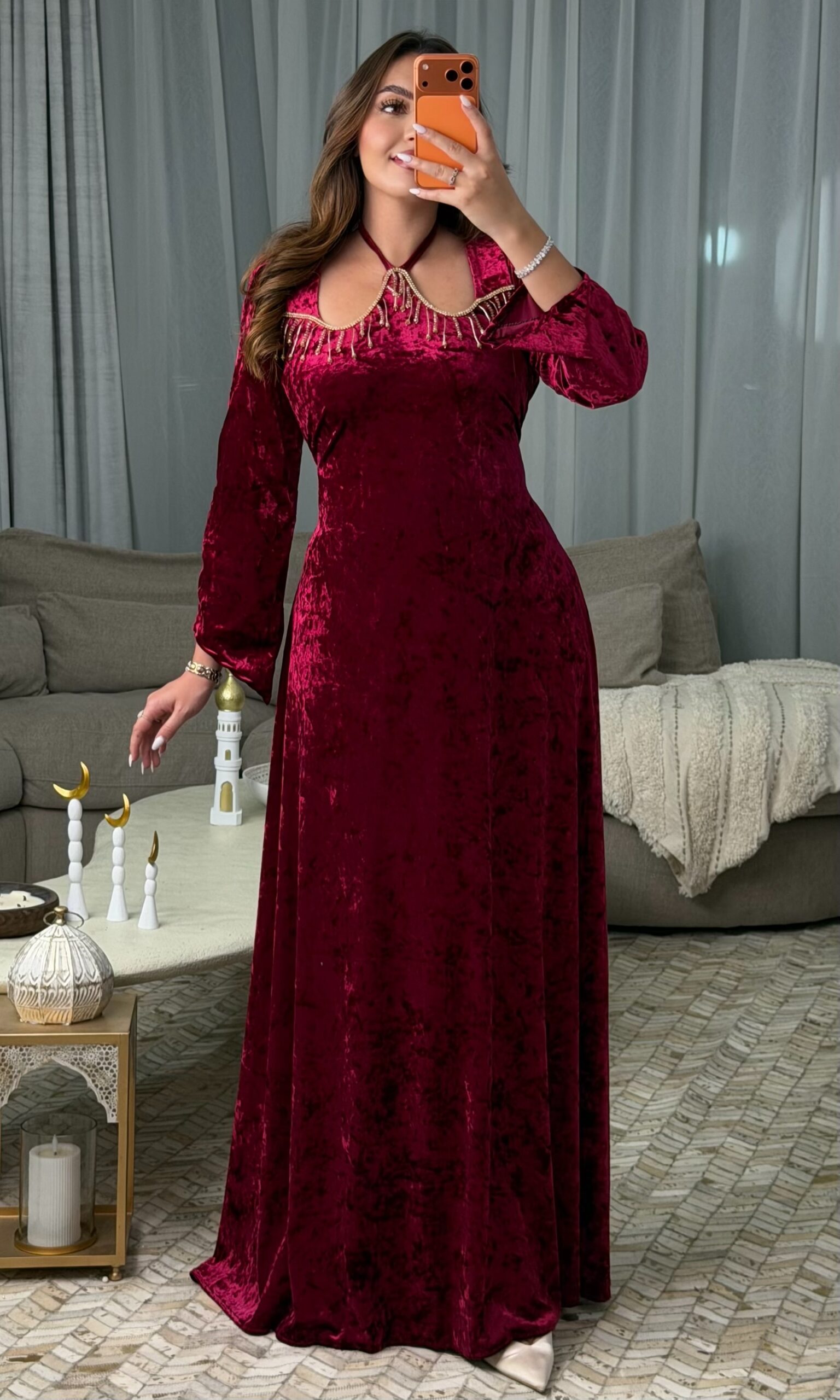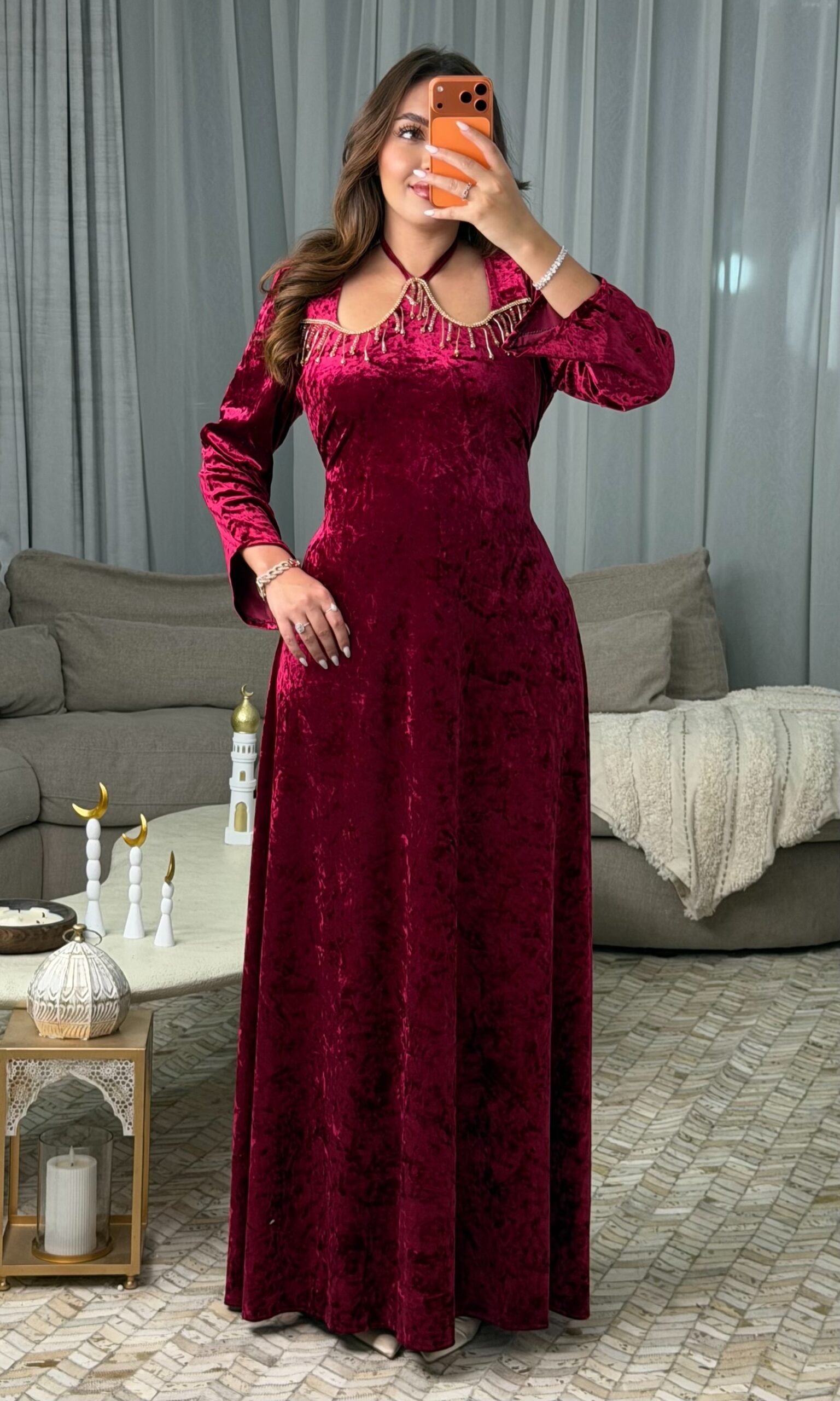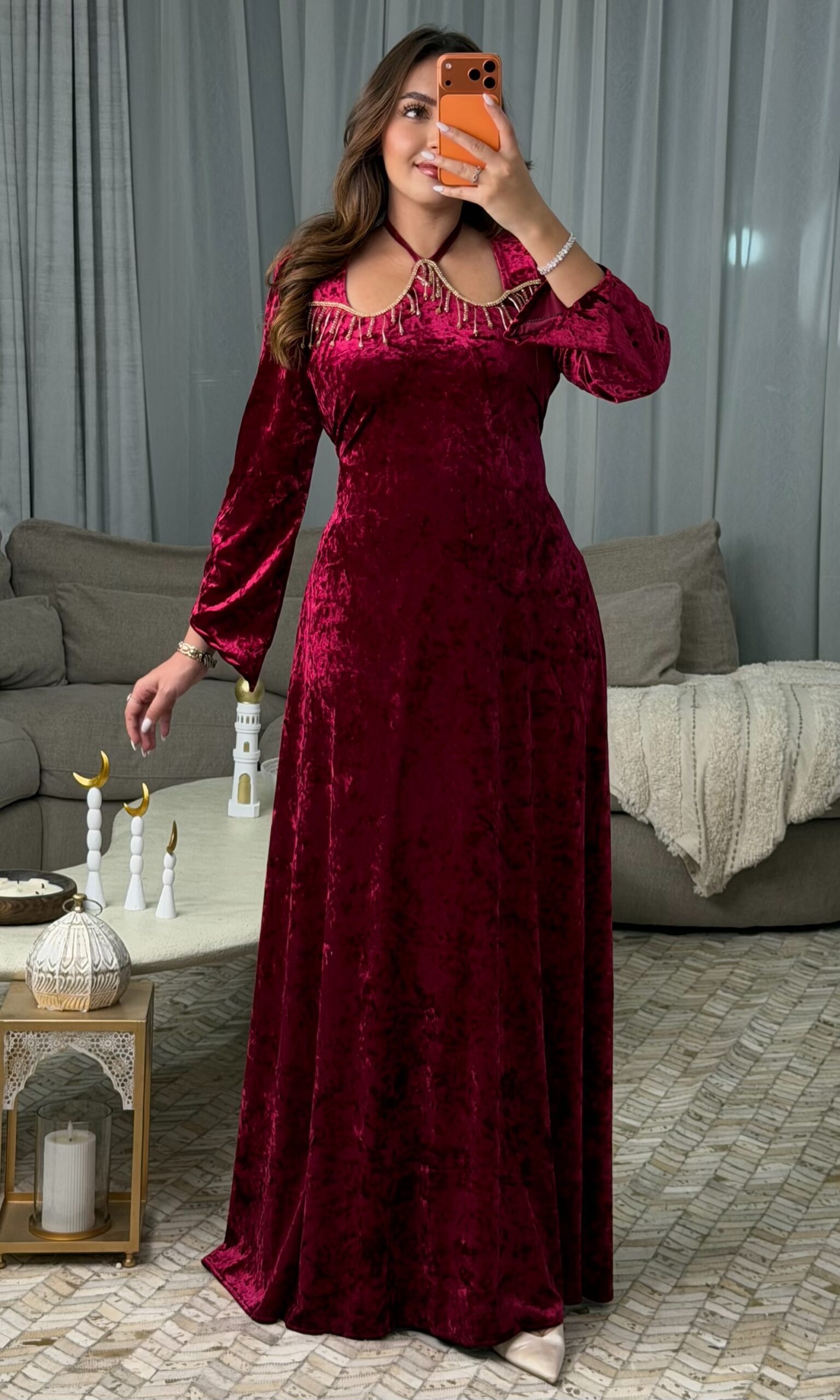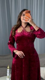 مصنوع من قماش القطيفة ماربري الفاخر الذي يمنحك ملمسًا ناعمًا ولمعة راقية، ليعكس ذوقًا أنيقًا يلفت الأنظار من أول إطلالة.