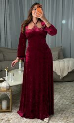 مع تصميم يربط في الرقبة ليبرز جمال العنق ويمنح الفستان طابعًا أنثويًا جذابًا.
