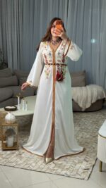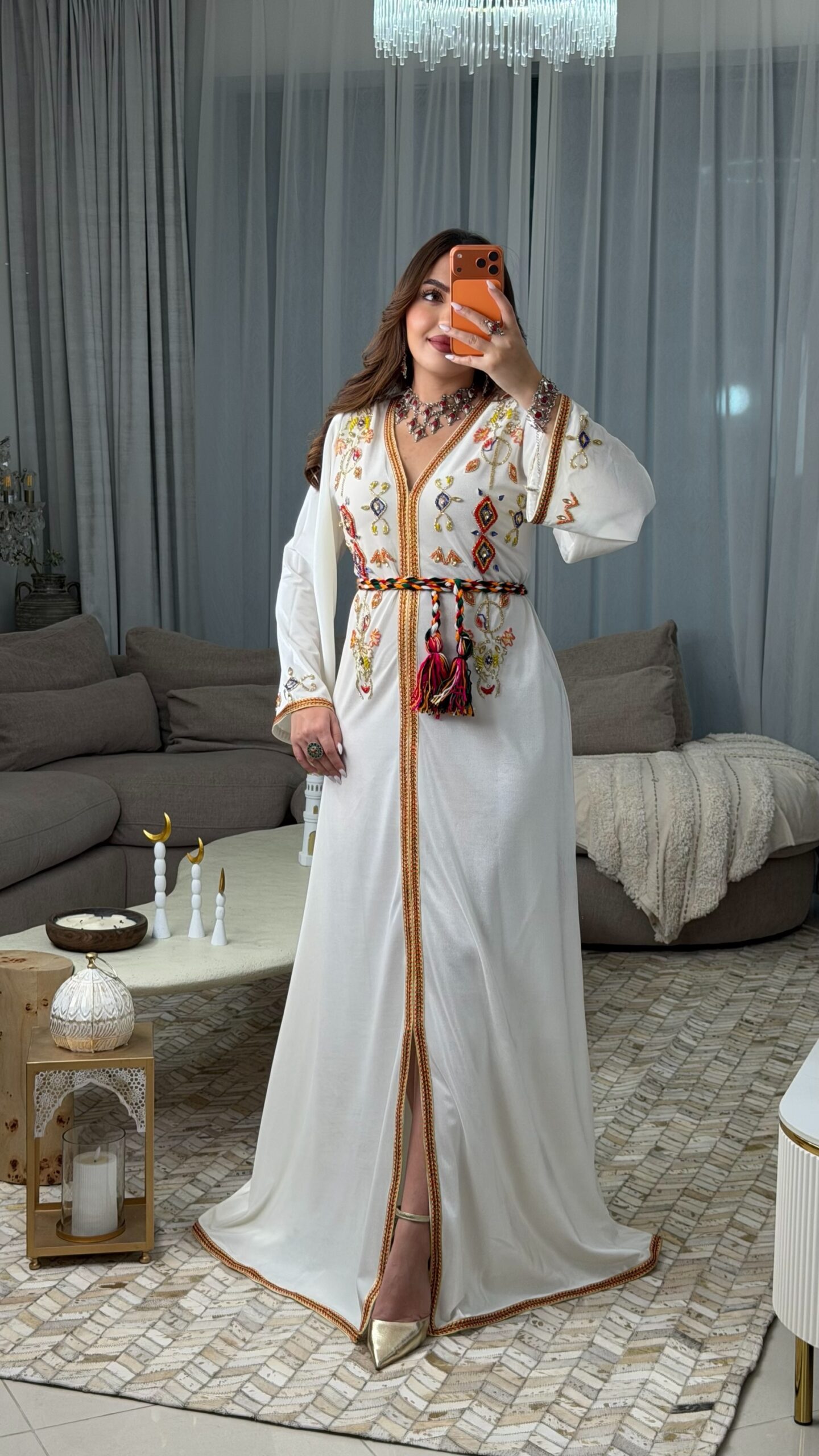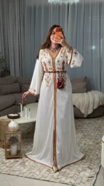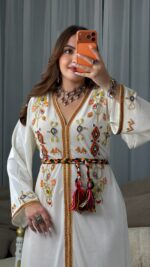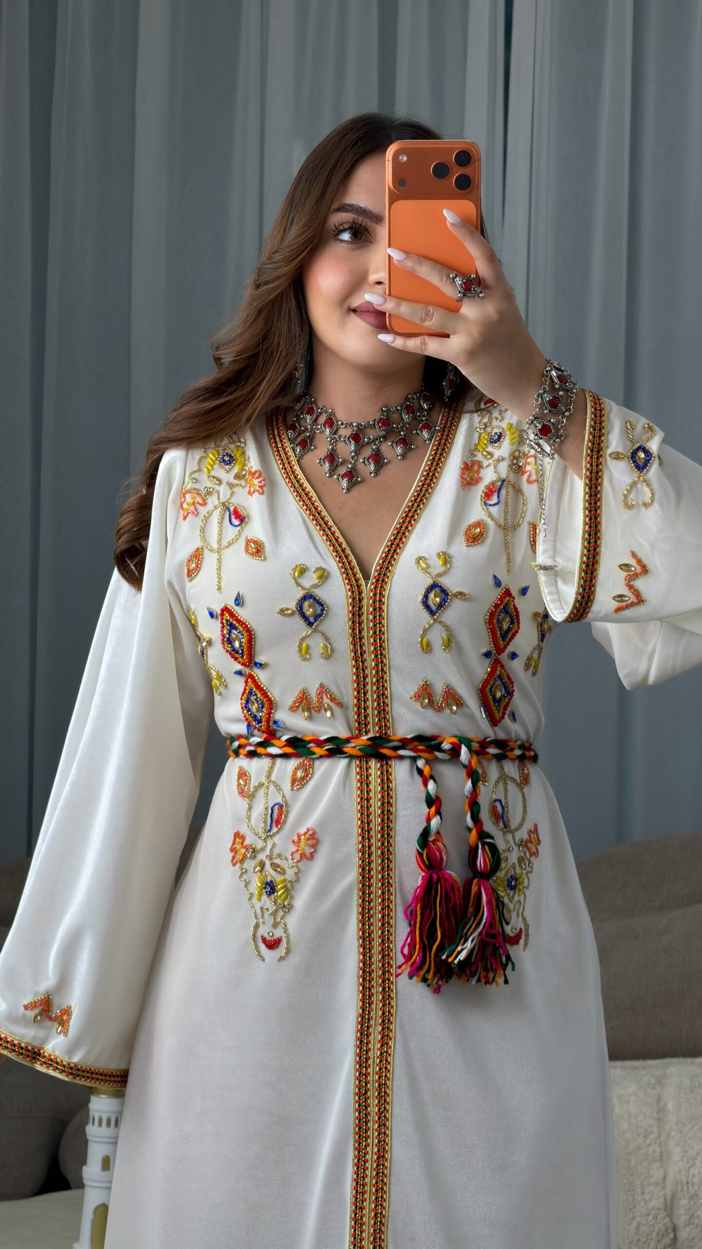 يأتي القفطان مرفوقًا بحزام بربر (حزام أمازيغي) يبرز القوام ويكمل الطابع التراثي الأنيق للتصميم.