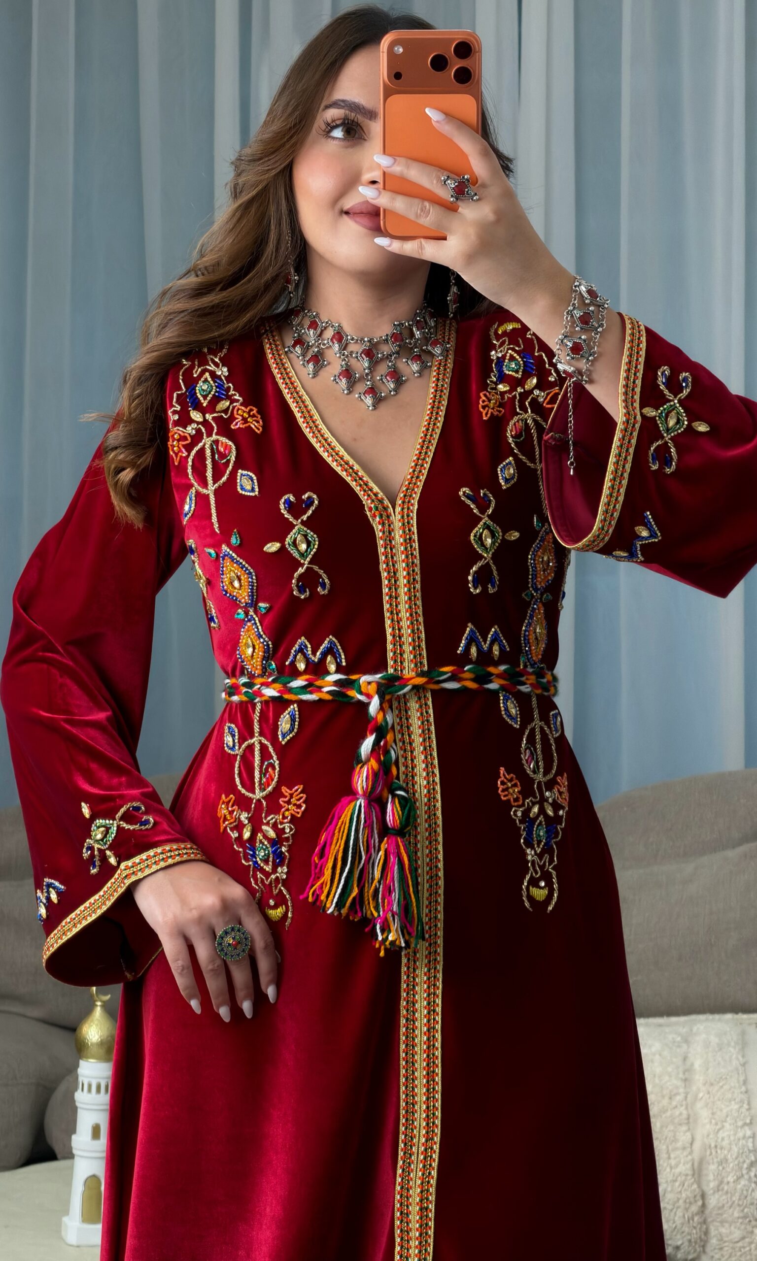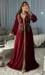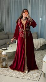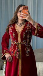مصنوع من قماش القطيفة الفاخر، ومزين بالكامل بـ أحجار أصلية تم تركيبها يدويًا بالإبرة والخيط بدقة عالية، على أشكال الحلي الأمازيغية التقليدية، البزيمة، والزخارف الأمازيغية الأصيلة، ليعكس ثراء التراث وجمال التفاصيل.