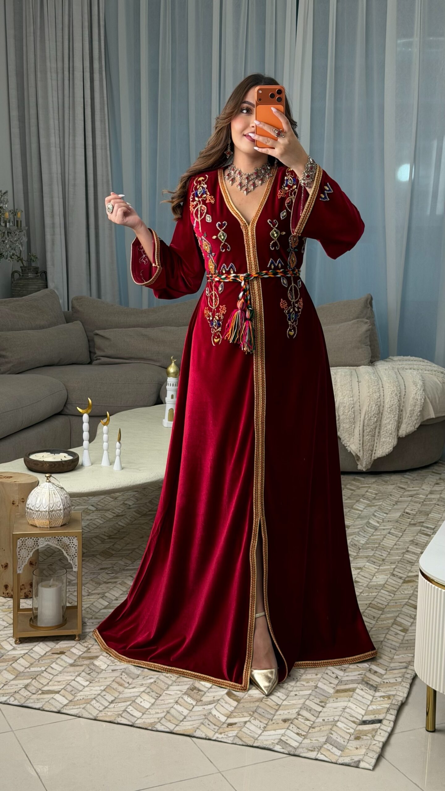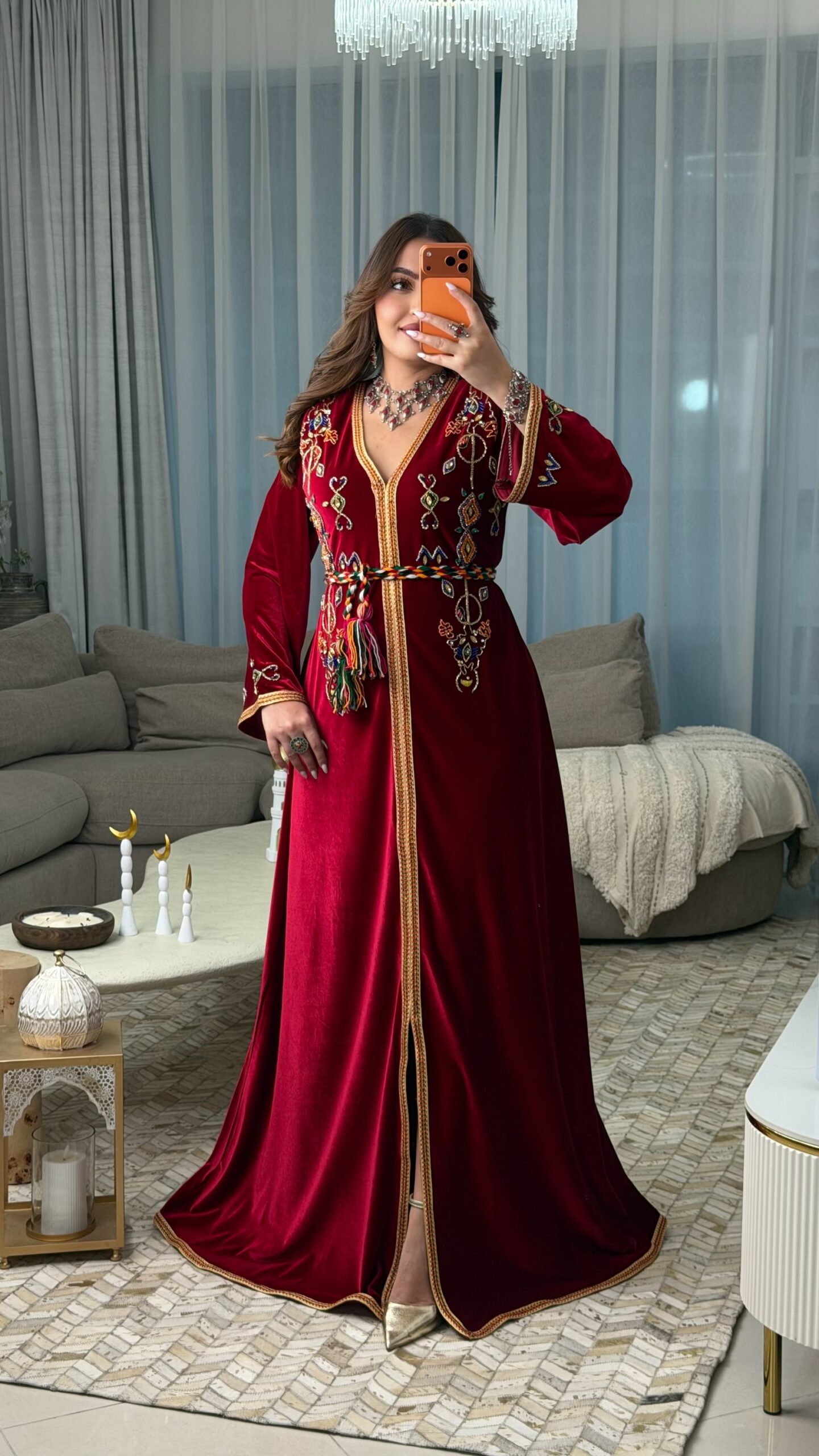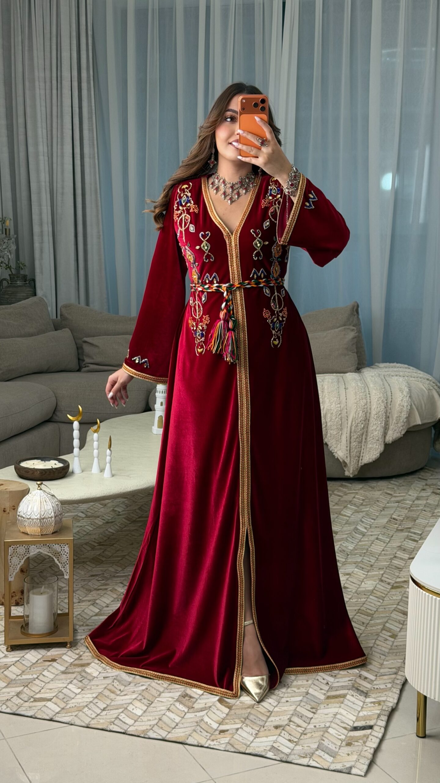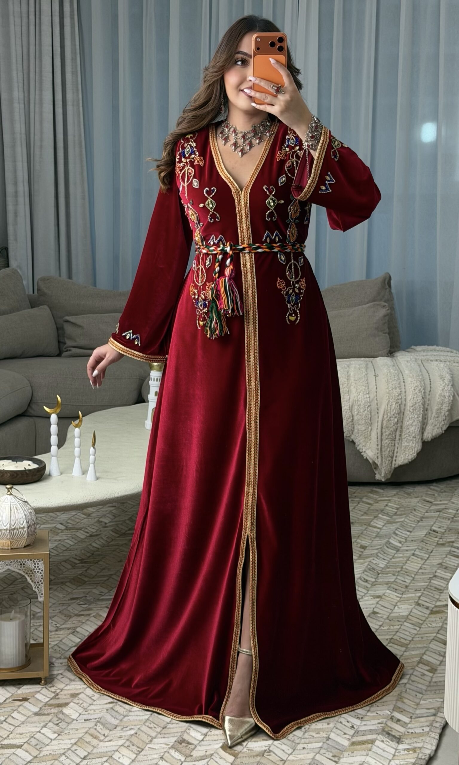 تم تزيين القفطان بـ الجالون الأمازيغي على طوله بالكامل، من الأعلى إلى الأسفل، وعلى الأكمام، وحتى الحاشية السفلية، ليمنح التصميم انسجامًا فريدًا ولمسة تقليدية راقية.