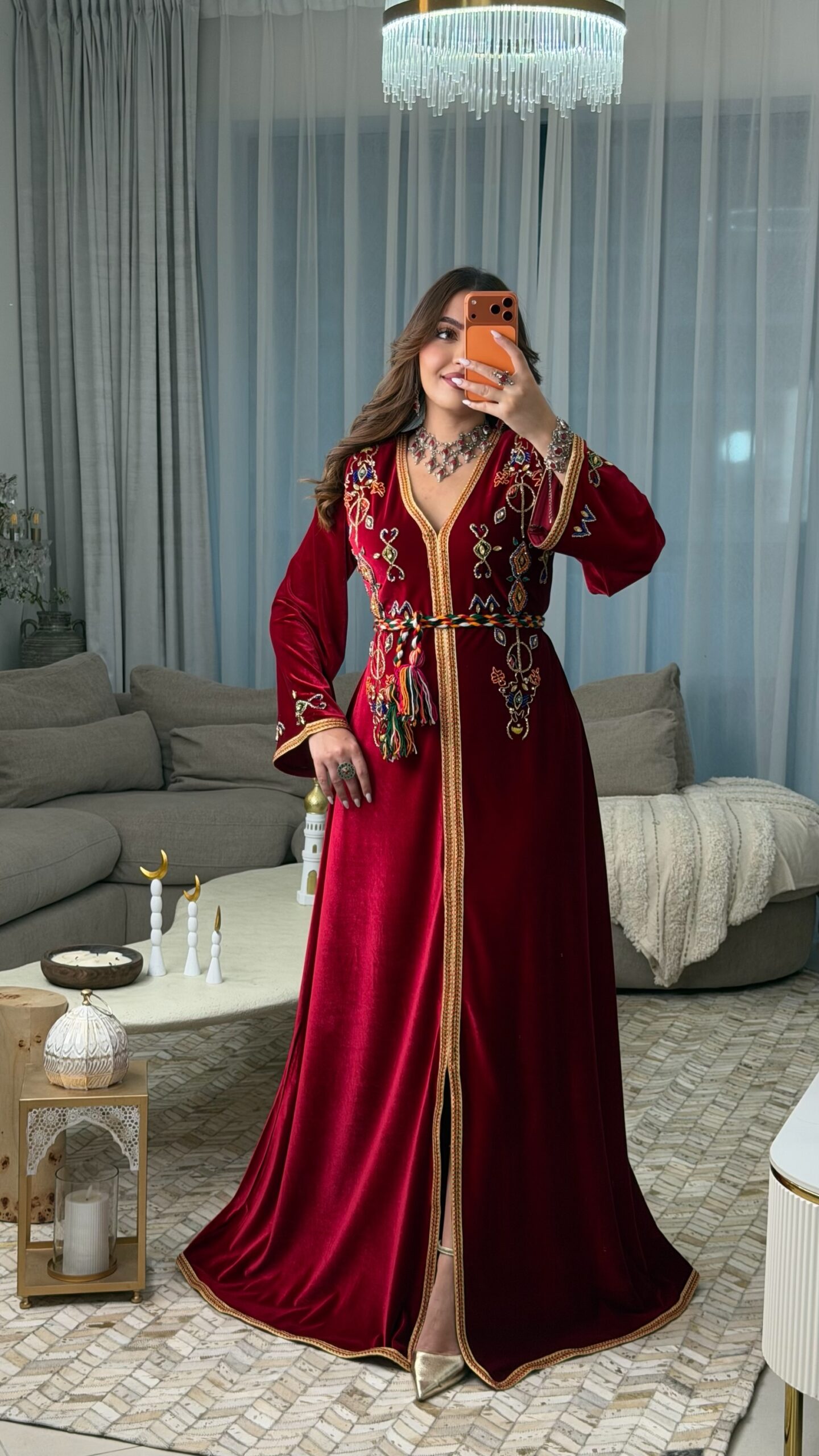 كما زُيّنت الأكمام أيضًا بأحجار أصلية مركبة يدويًا، لتكمل فخامة القفطان من كل الزوايا.