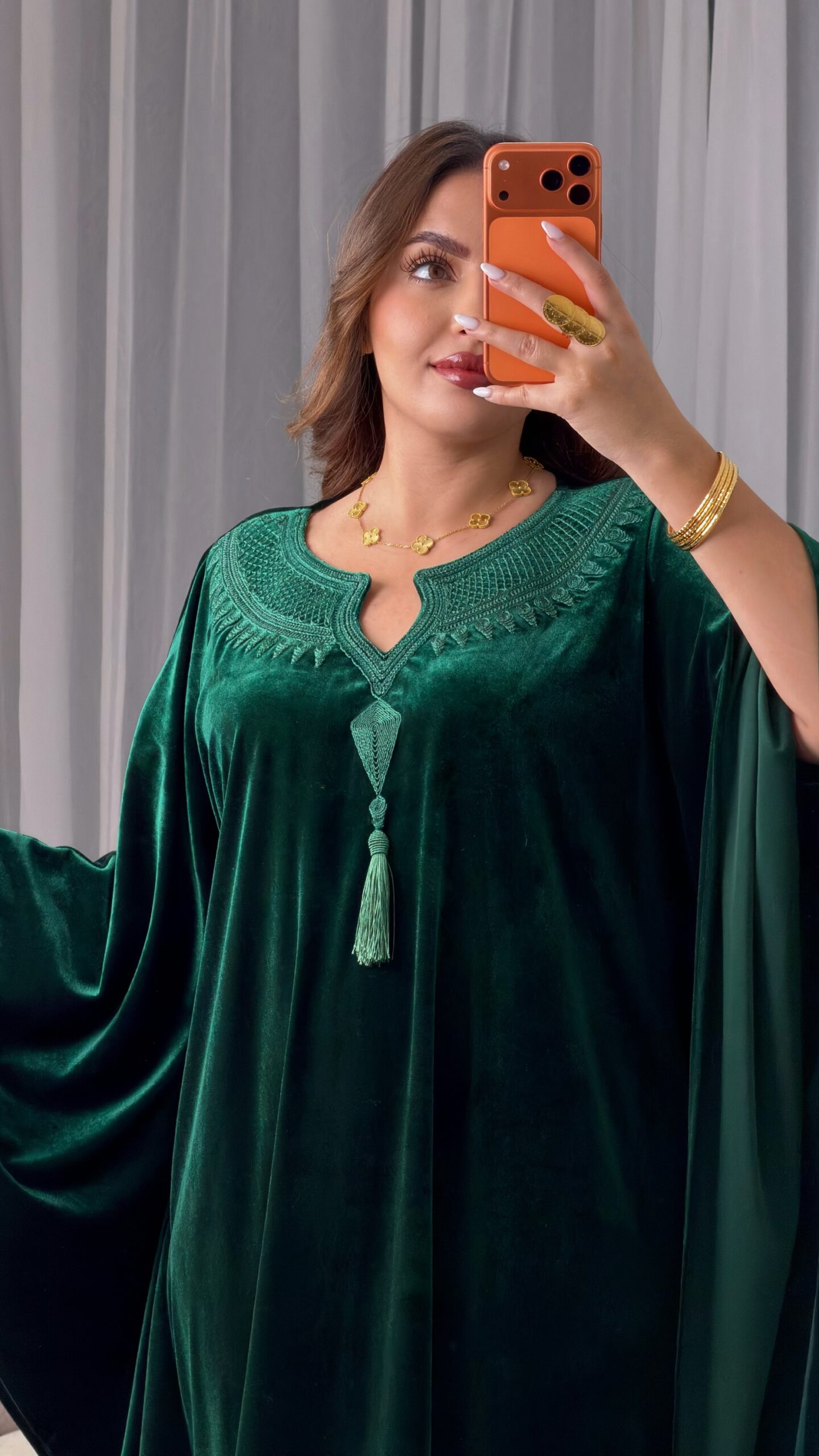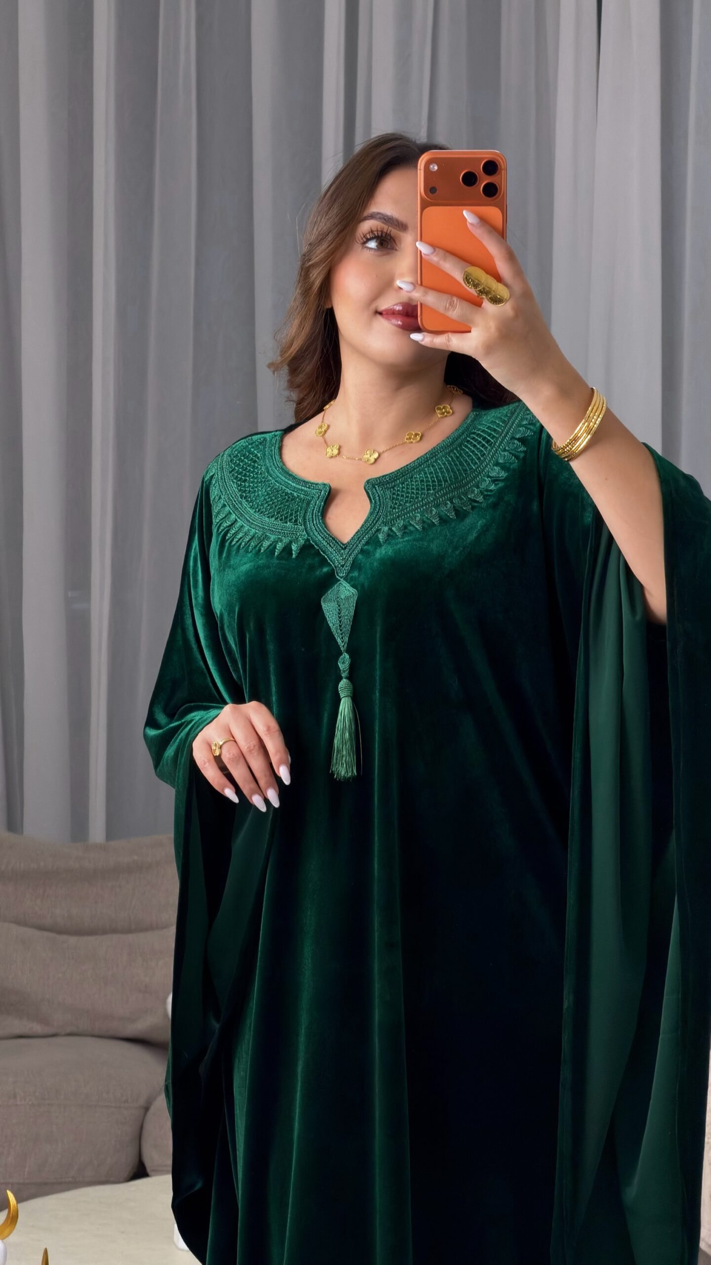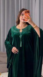 مزين بتطريز وحياكة يدوية متقنة في منطقة الصدر، تضيف لمسة فخامة ورقي للتصميم، ليكون خياراً مثالياً لسهرات رمضان والعيد.