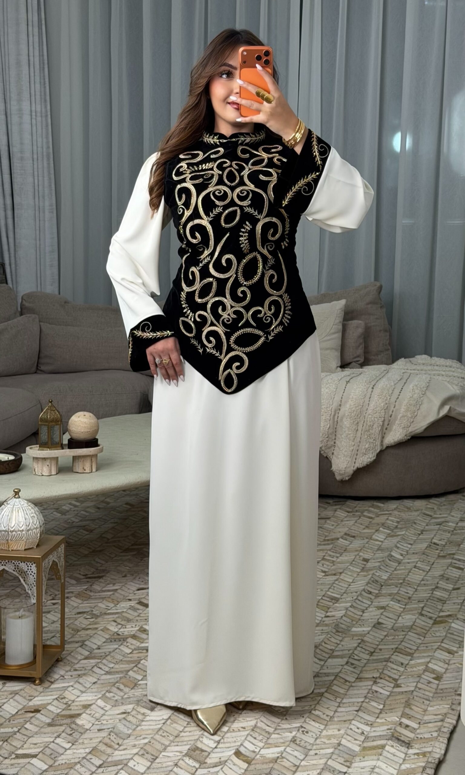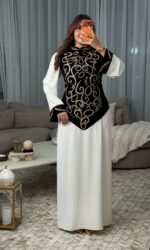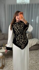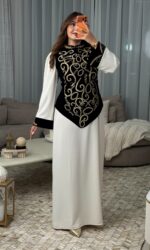 الفستان مصنوع من قماش الكريب الناعم بانسيابية راقية، مع نهاية أكمام من قماش الدان مزينة بتطريز أنيق يضيف لمسة فخامة مميزة.
