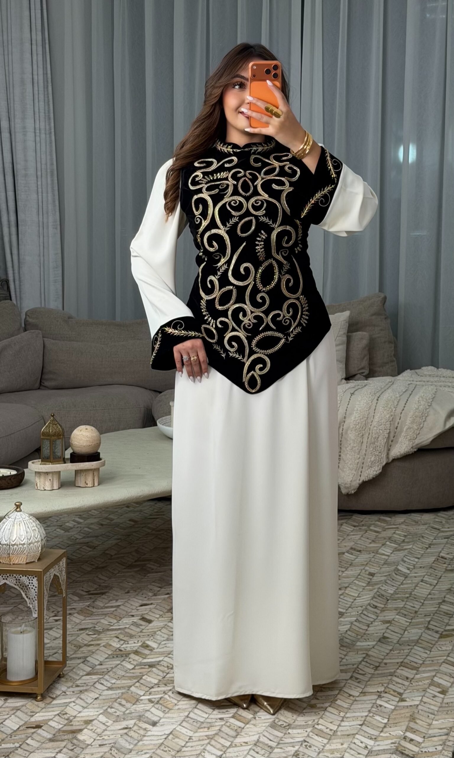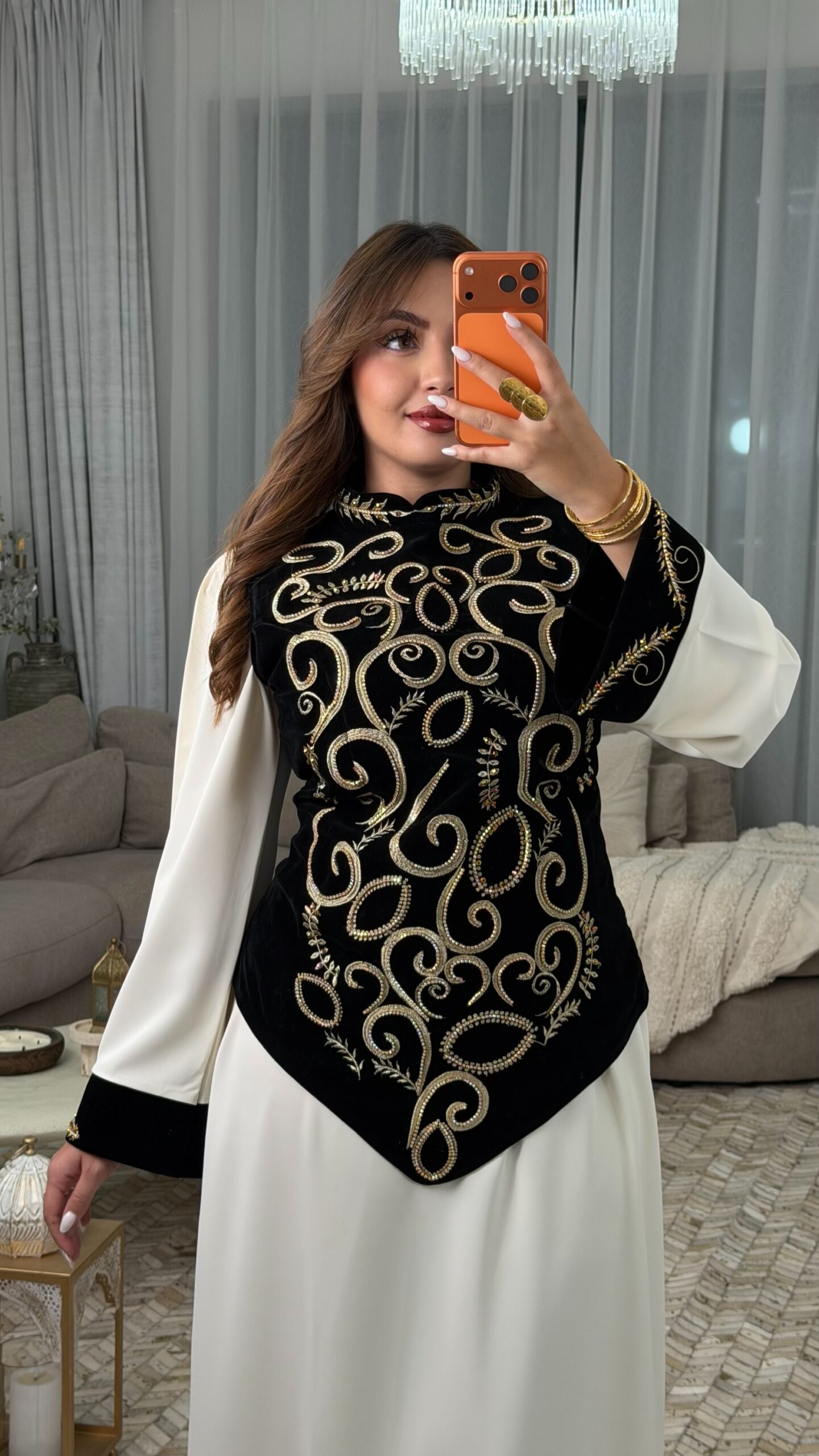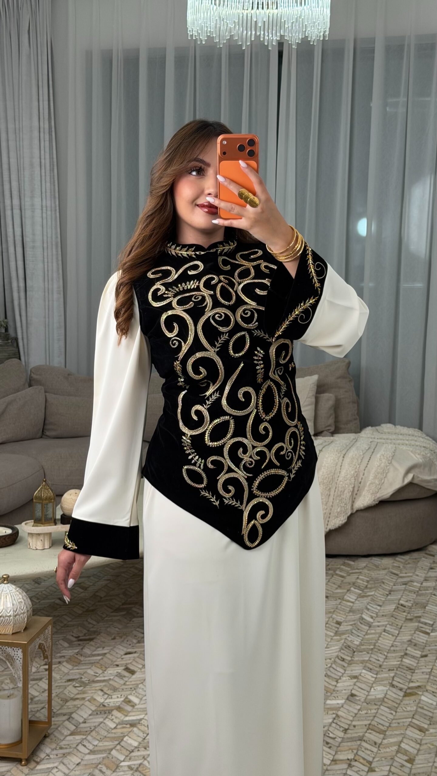تم تزيين الكورسيه بالكامل بتطريز مستوحى من المجبود التقليدي الجزائري، منفّذ بدقة عالية تعكس الحرفية والأصالة.