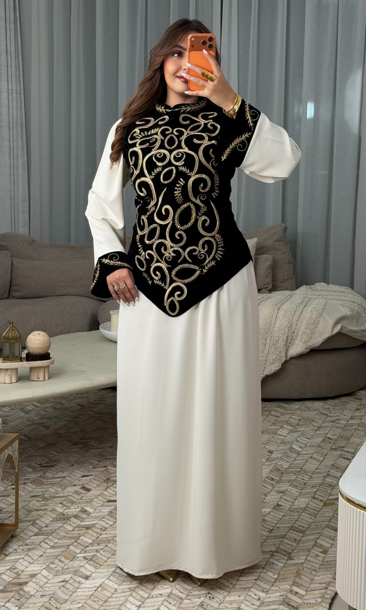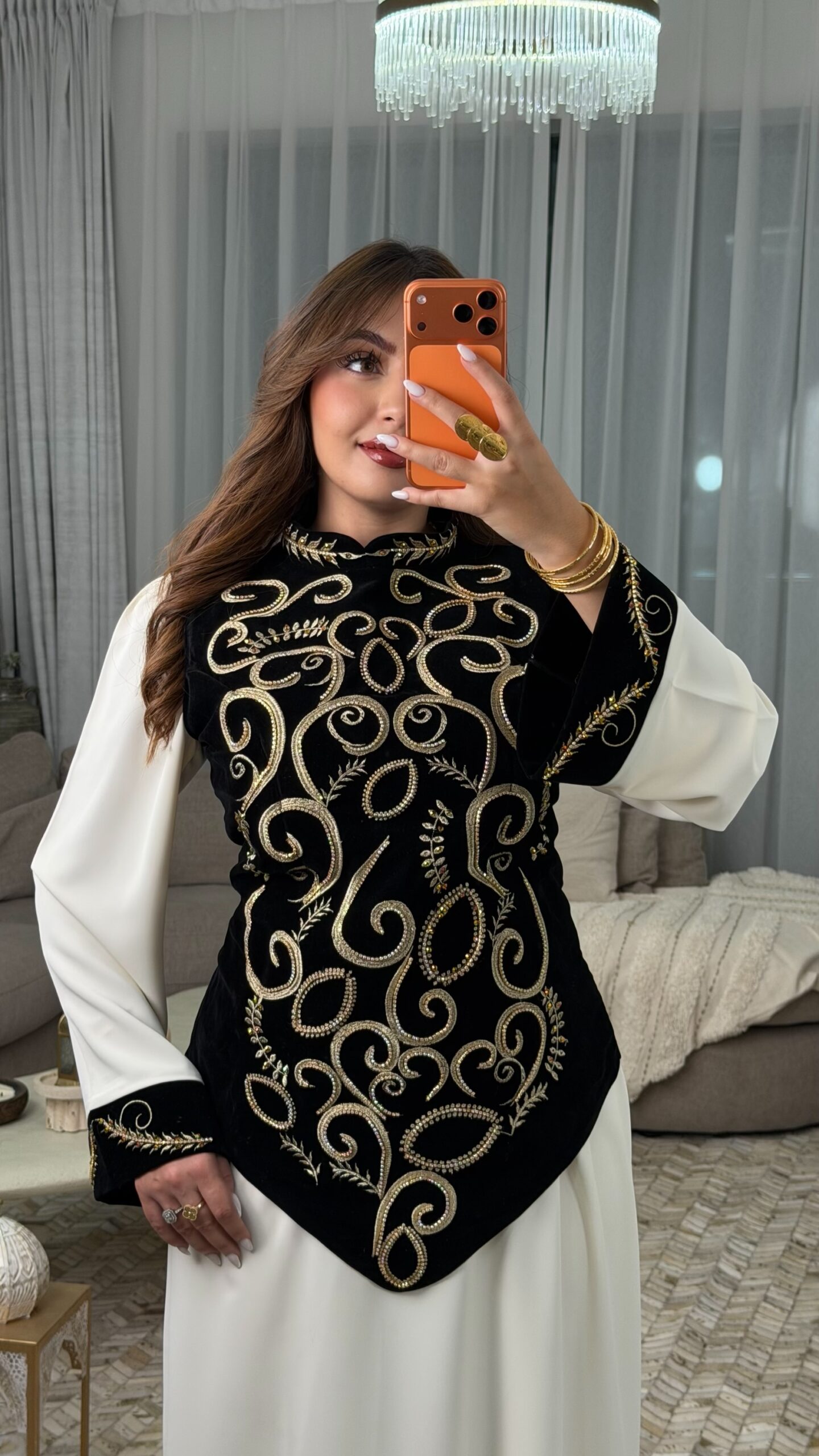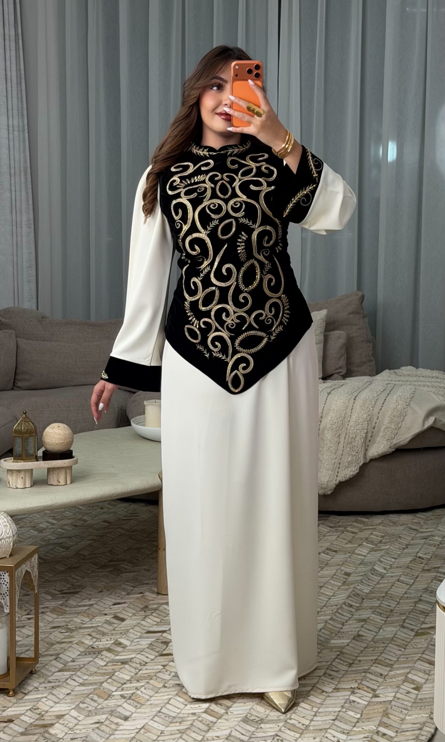 تم تزيين الكورسيه بالكامل بتطريز مستوحى من المجبود التقليدي الجزائري، منفّذ بدقة عالية تعكس الحرفية والأصالة.